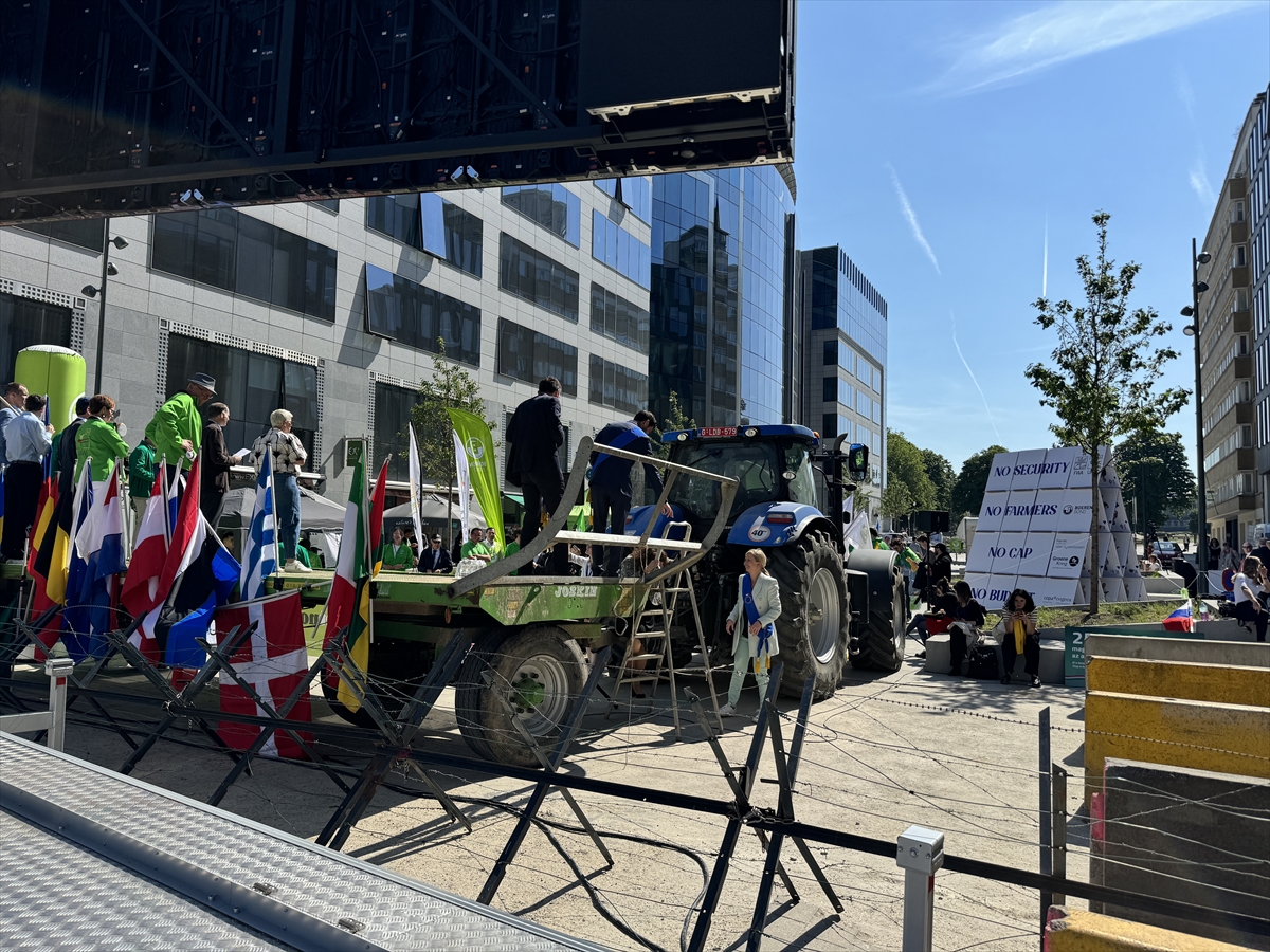 AB kurumları önüne sembolik olarak bir traktör getiren çiftçiler, Birliğin tarım politikası çerçevesinden duydukları rahatsızlıklara dikkati çekti.