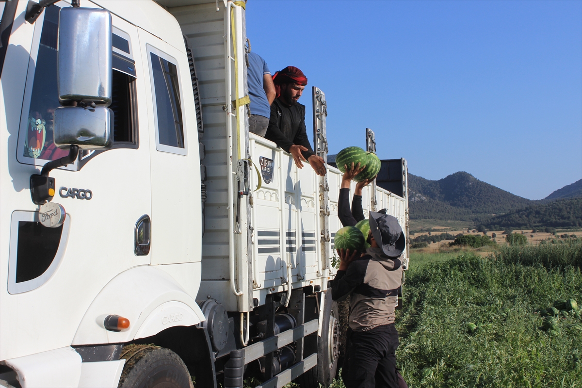 Tüccarlar tarafından alınarak kamyonlara yüklenen karpuzlar, İstanbul başta olmak üzere birçok kente götürülerek manav, market ve pazarlarda tüketiciye buluşturuluyor.