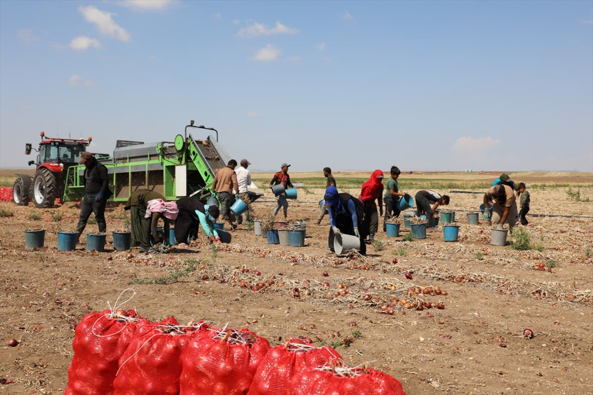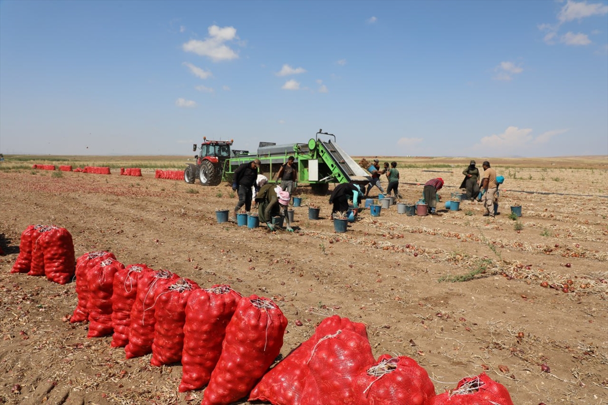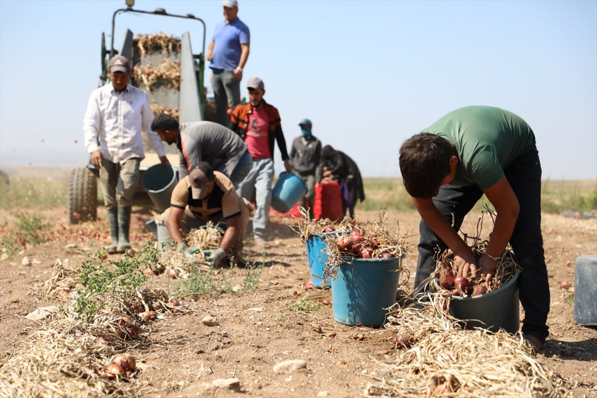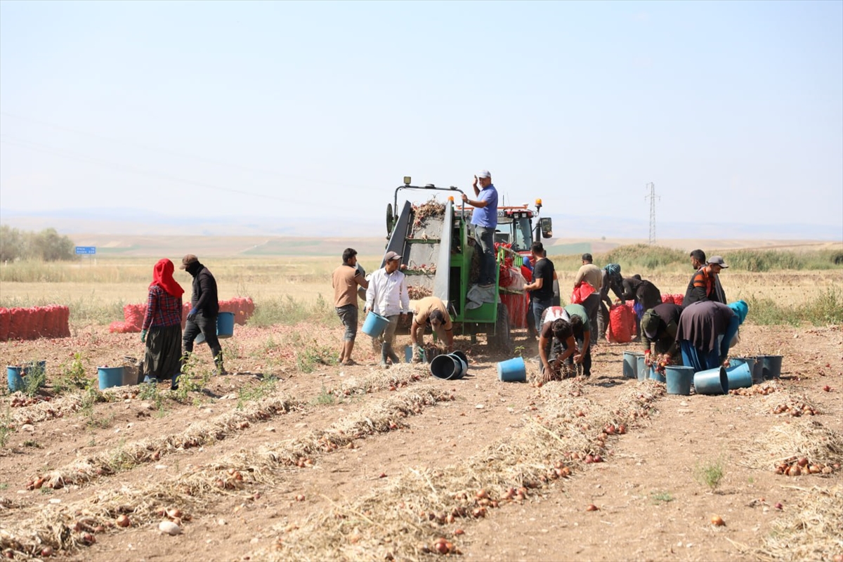 Günün erken saatlerinden itibaren tarlalara giden üreticiler, mevsimlik tarım işçilerinin de yardımıyla mor soğanları topluyor.
