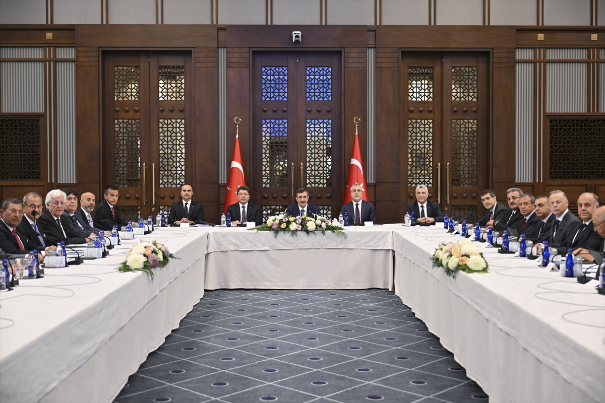 Cumhurbaşkanlığı Külliyesi'ndeki görüşmede, Adalet Bakanı Yılmaz Tunç, Çalışma ve Sosyal Güvenlik Bakanı Vedat Işıkhan, Sanayi ve Teknoloji Bakanı Mehmet Fatih Kacır, Ticaret Bakanı Ömer Bolat, Cumhurbaşkanlığı Strateji ve Bütçe Başkanı İbrahim Şenel ve bazı bakan yardımcıları da yer aldı.