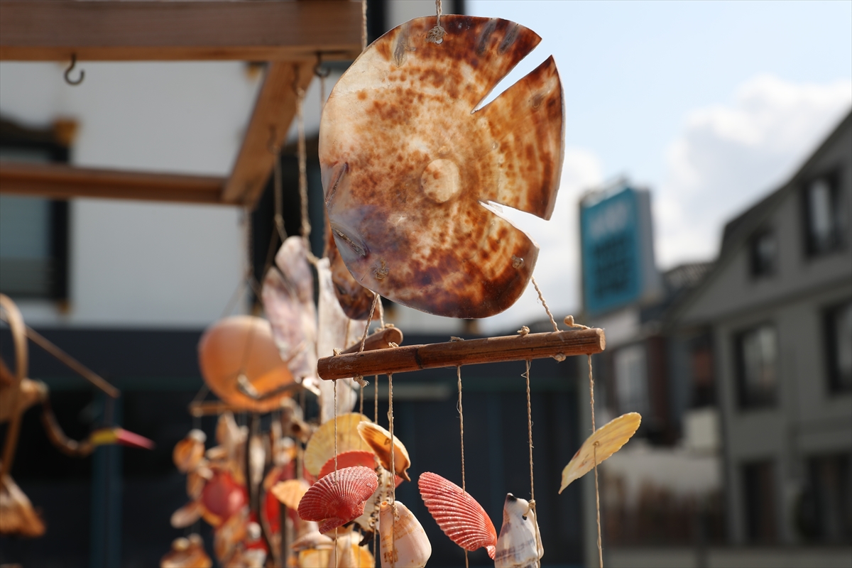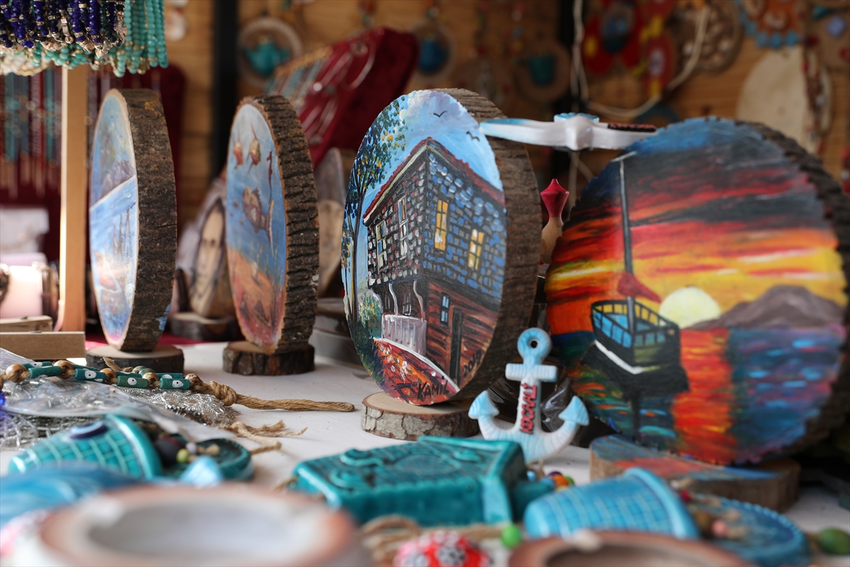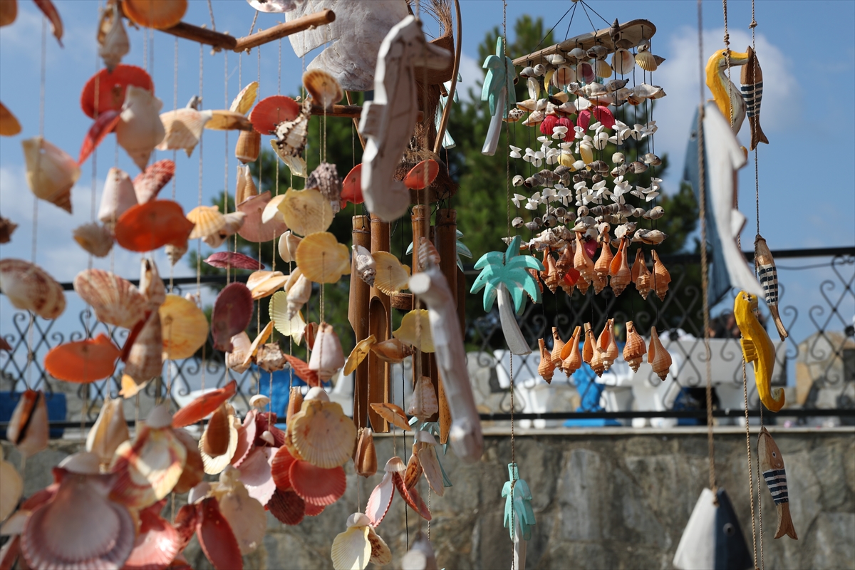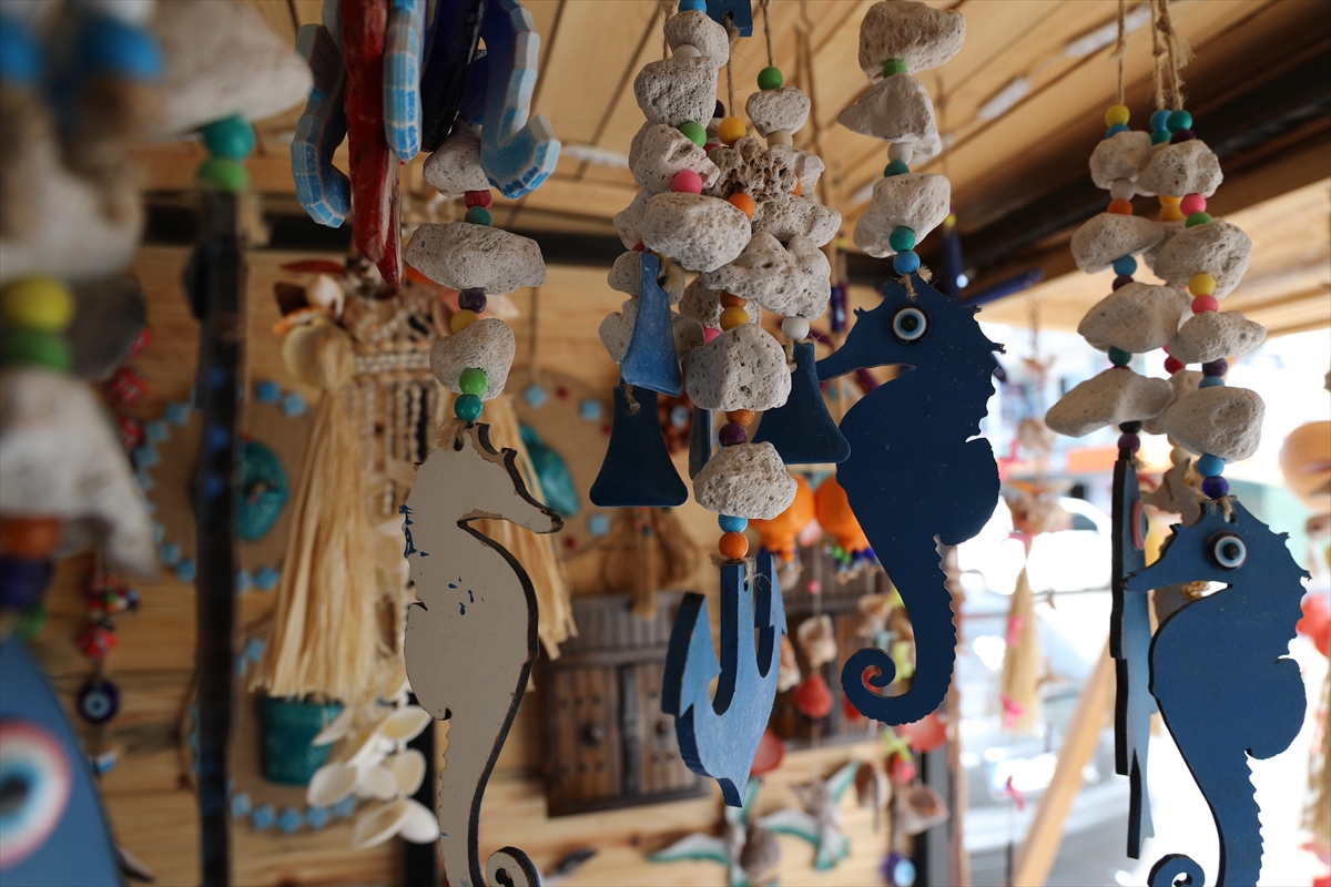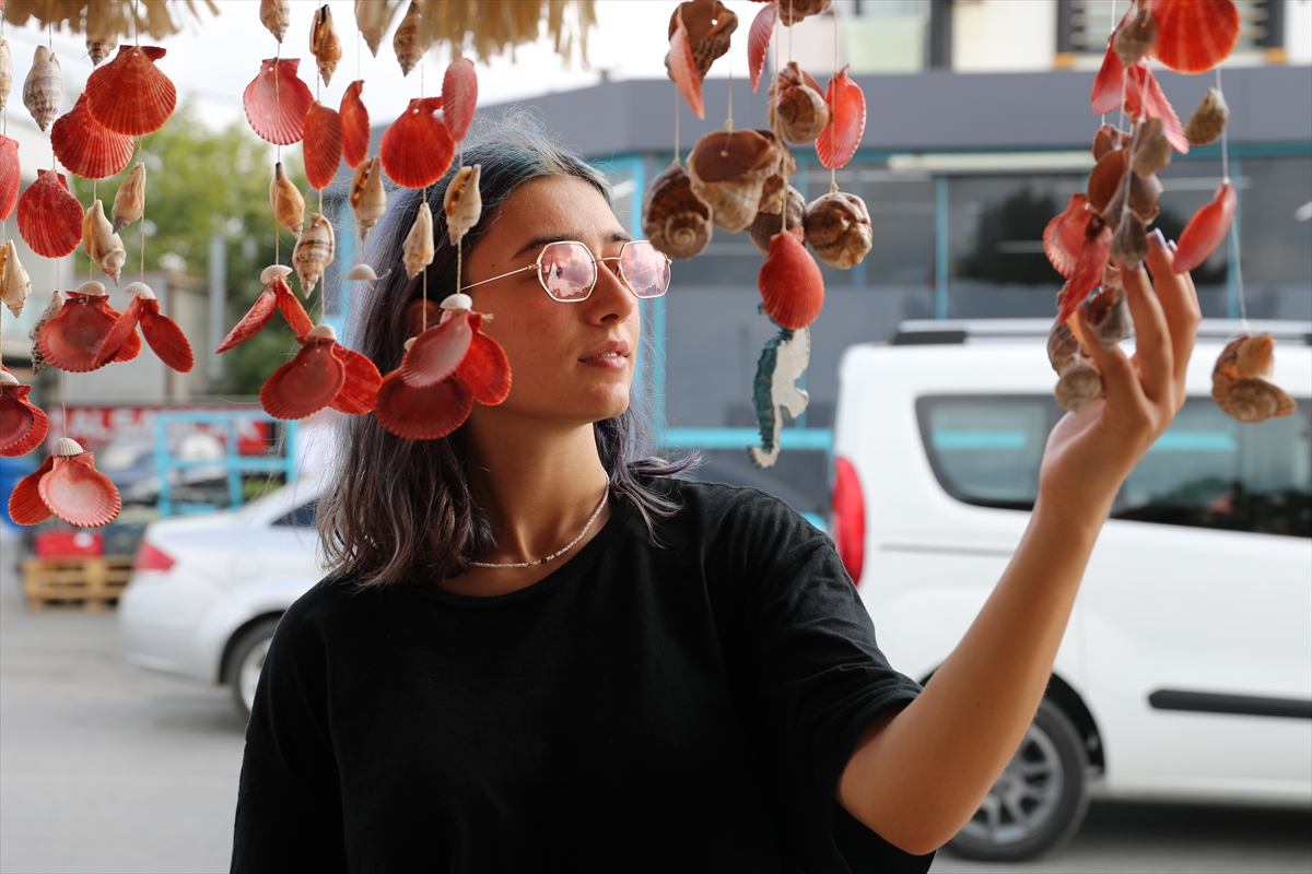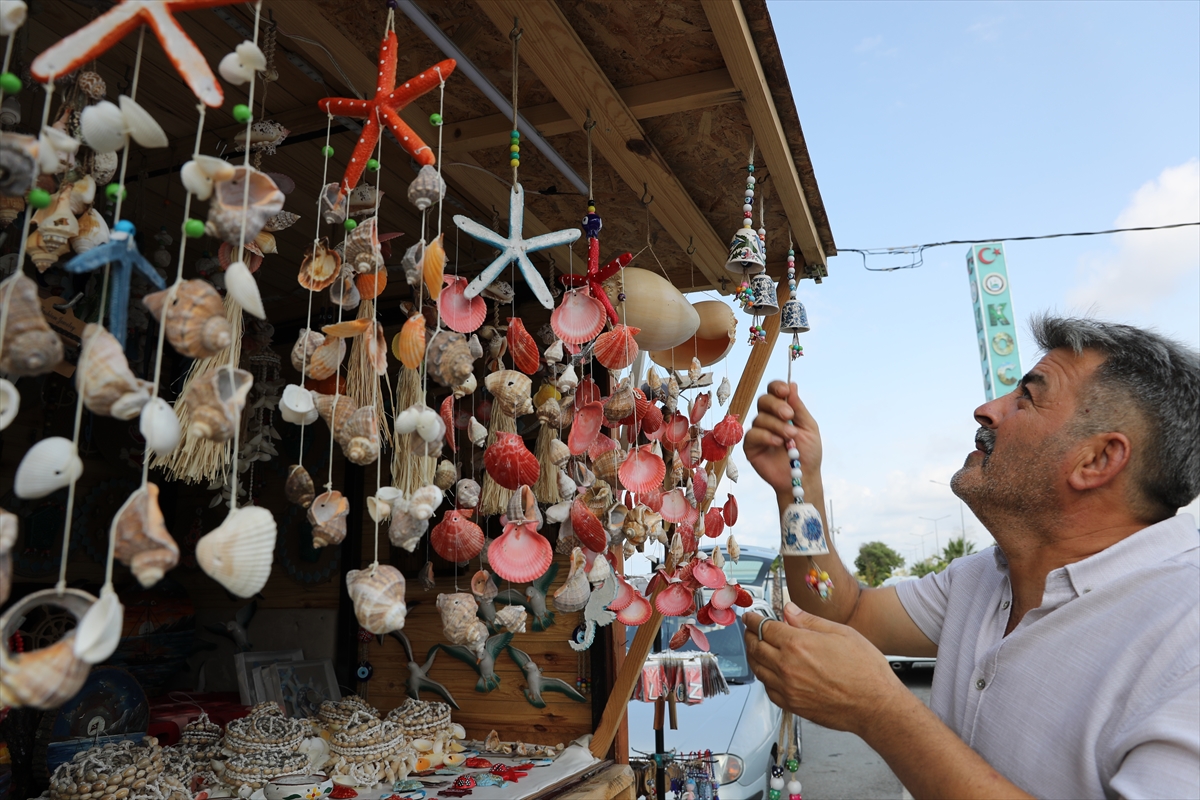 Sahilden topladığı deniz kabuklarından süs eşyası üreten, ahşap malzemeleri çeşitli hediyelik ürünlere dönüştüren Deniz, bunları seyyar tezgahında satıyor.