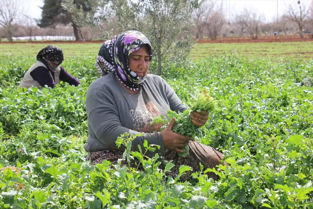 Aile bütçelerine katkıda bulunmak için çalışan kadınlar, tarlada roka ve tere hasadı yapıyor.