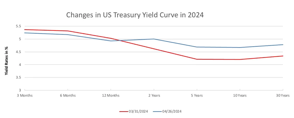 In April bond prices, particularly those with longer maturities, had a down month similar to equities. However, unlike equities this was not triggered by a reversal in sentiment. It was rather a continuum of the previous period as bond markets had already been expecting the rates to remain elevated a bit longer as we discussed extensively in a number of our previous issues. The only main change in April was that the shape of the US yield curve flattened a bit (blue line in the graph below) compared to March (red line). What that means is the shorter-term yields went down while the longer-term ones went up as illustrated below.