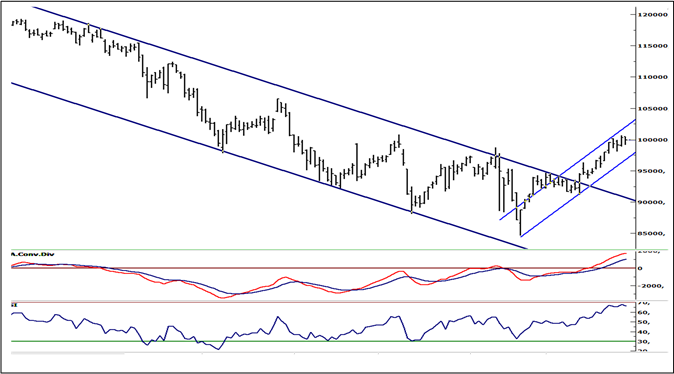 BIST100 endeksi geçtiğimiz hafta pozitif yönde hareket etti. Endeksin haftalık hareket bandı 99.957-100.637 aralığında gerçekleşirken, haftalık bazda %2,01 oranında yükselişle 99.957 puandan kapanış gerçekleşti. Geçtiğimiz haftaya 98.284 puandan yükselişe başlayan endeks 100.000 seviyesi üzerine yükseliş denemelerinde satış baskısı altında kaldı. Mart ayın başlayan alçalan kanal hareketinin üzerinde üçüncü hafta kalınması orta vadeli görünüm açısından olumlu. Yeni haftanın ilk yarısında 5 günlük AO (99.700) üzerinde harekete kalınması kısa vadeli satışların artmaması için önemli. Bu seviye üzerinde ise orta vadeli teknik yönde takip ettiğimiz 100.450 (200 günlük AO) önem arz ediyor. Sonraki hedef dirençle olarak ise 102.500 ve 105.000 izlenebilir. Endeksin 99.700/99.500 bandı altında harekete başlaması halinde ise 98.000 desteğine kadar geri çekilme olabilir. Dolar bazında haftayı 1,65 centten kapatan endeksin önemli trend direnci 1,70 centte bulunuyor. BIST100 endeksinde açılışın pozitif olmasını bekliyoruz.