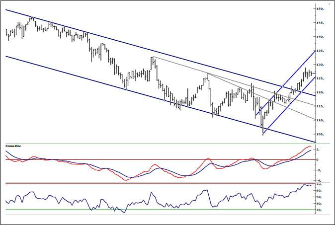 Haftanın ilk yarısında 128.800 puana kadar hızlı yükselen VIOP30 yakın vade kontratında gelen satışlar 125.000 civarında karşılandı. Kontratta haftalık bazdaki işlemlerde 124.800-128.800 aralığında hareket edildi. Kontrat son üç haftadır mart ayından gelen orta vadeli alçalan kanal üstünde hareket edilmesi ve 200 günlük AO üzerinde haftanın kapatılması orta vadeli teknik görüntü açısından olumlu. Ayrıca endeksin orta vadeli göstergesi MACD son bir haftadır sıfır çizgisi üzerine yükselerek alım konumunu güçlendirdi. Hafta başında 5 günlük AO 126.650 üzerinde hareketin başlaması satışların artmaması için önemli. Aşağıda yükselen kanal alt bandı ve 200 günlük AO’nın yaklaştığı 125.000 önemli direnç konumundadır.