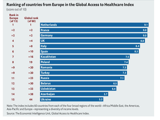 2017 yılında Economist İstihbarat Birimi tarafından yapılan (Global Access to Healthcare index) Küresel Sağlık Hizmetlerine Erişim Araştırması’na dayanarak, sağlık hizmetine ulaşabilme konusunda birkaç gelişmekte olan ülkenin, Küba, Brezilya, Tayland, Kolombiya, Kazakistan dahil olmak üzere bazı gelişmiş ülkelerin önünde yer almaya başladığını ön görüyor.