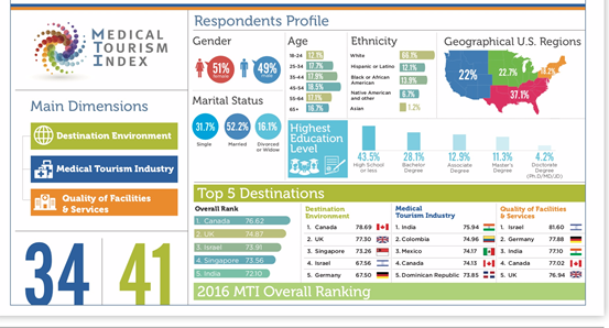 Araştırma sonucuna göre hastalar, Kanada’yı en çok‘çevresel faktörler ve maliyet avantajı’ sebebiyle tercih ediyor.İsrail’i farklı bir destinasyon deneyimi yanında medikal yatırım ve servis kalitesi için, Almanya’yı ise medikal hizmet sağlayıcılarının yatırımları ve hizmet kalitesi için tercih ediyorlar. Medikal turizmde, iki segment insan grubu seyahat tercih ediyor. Bunların bir bölümü, diğer ülkelere gençleşmek amacıyla seyahat eden gelir düzeyi yüksek kişiler. Diğer bölümü ise kendi ülkelerinde mevcut olmayan tedavi veya yüksek maliyetler sebebiyle tedavi ve bakım için seyahat ediyor.