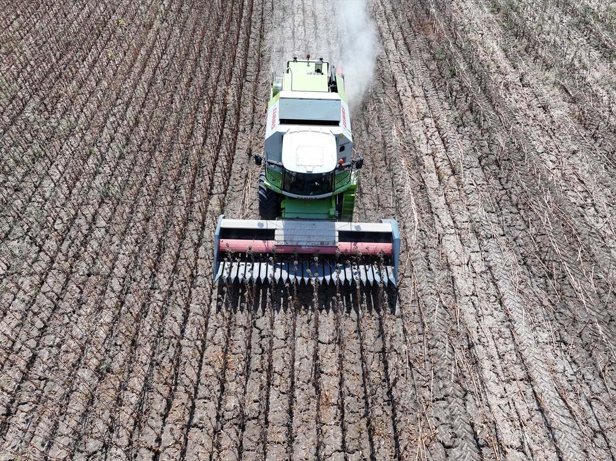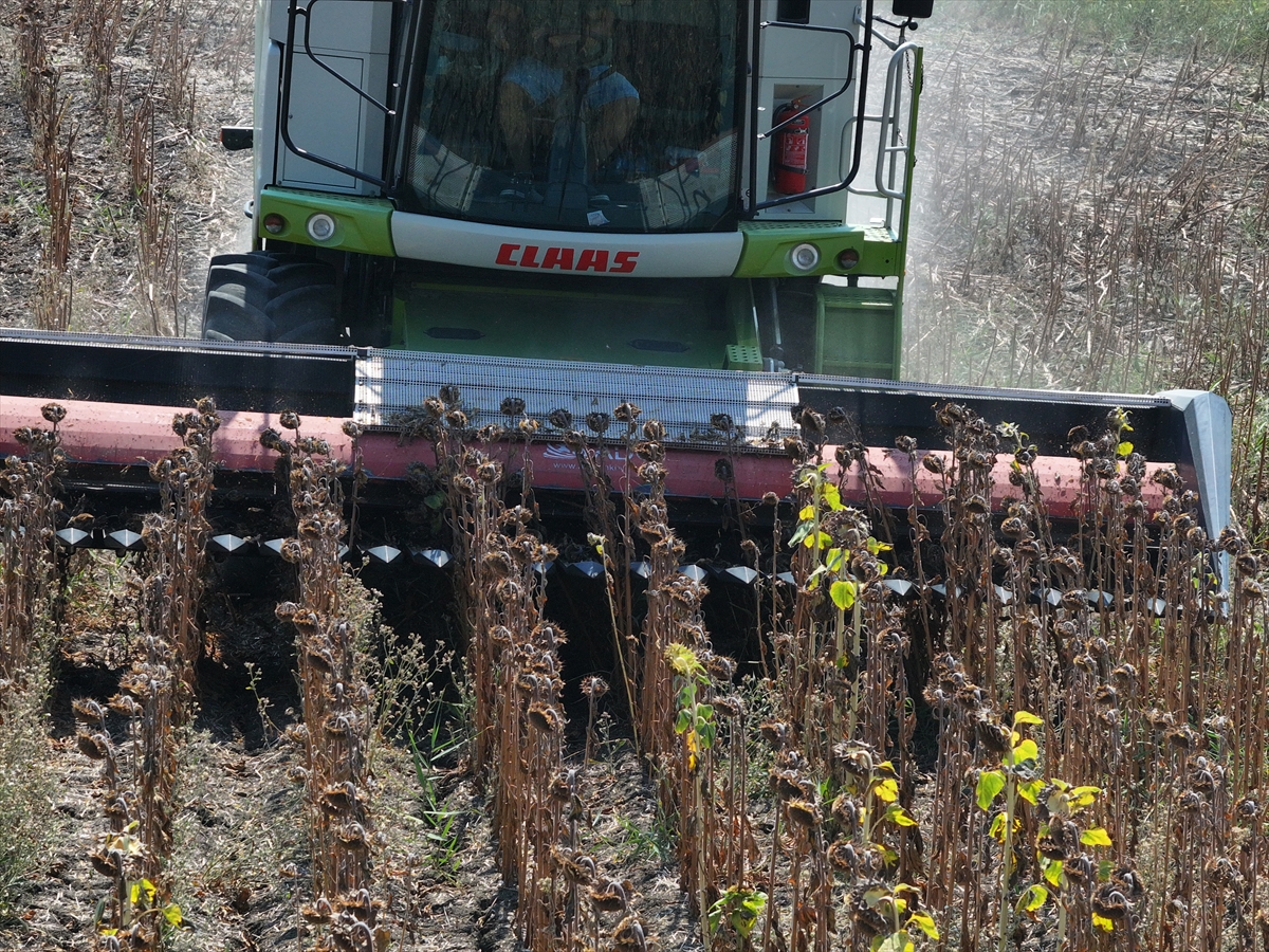 Bu yıl aşırı sıcaklar nedeniyle erken kuruyan ayçiçekleri biçerdöverlerle hasat ediliyor.