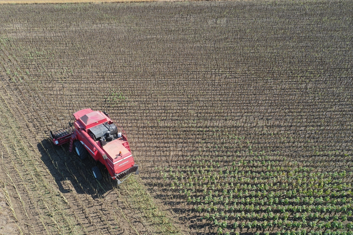 Şubat ayının sonunda ekim yapılan tarlalardaki ayçiçekleri biçerdöverlerle hasat ediliyor.