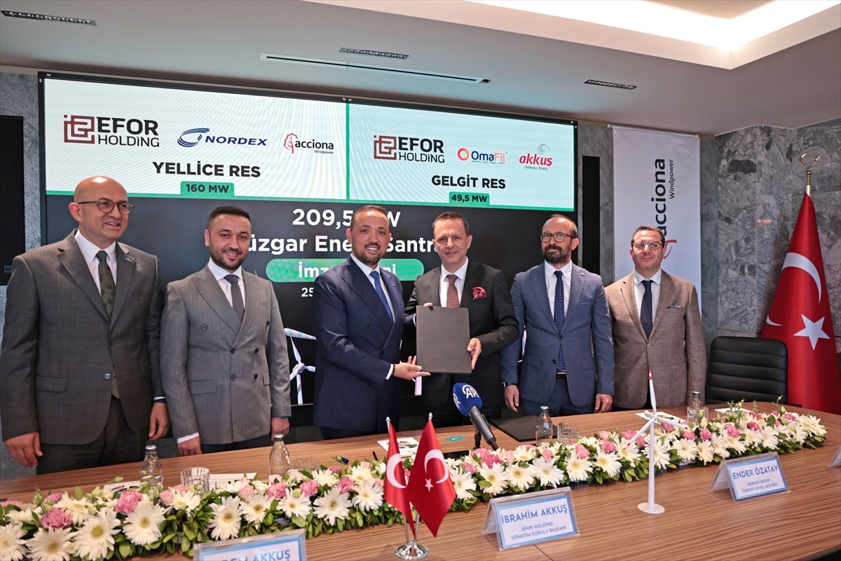 İSTANBUL (AA) – Efor Holding, toplam 280 milyon dolar yatırımla hayata geçireceği 209,5 megavatlık iki rüzgar enerji santrali (RES) projesi için Almanya merkezli Nordex Group ile türbin tedarik anlaşması imzaladı.