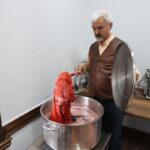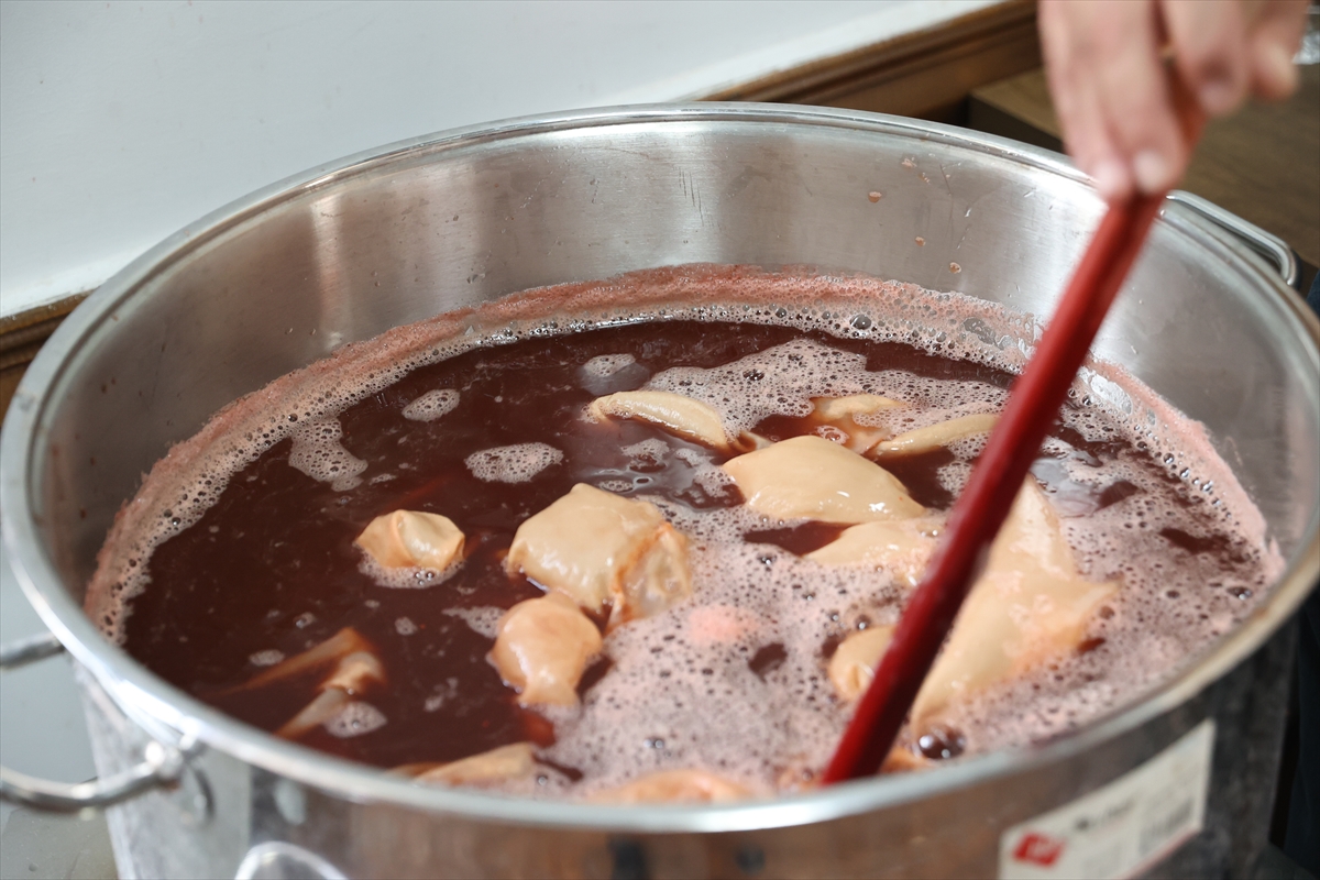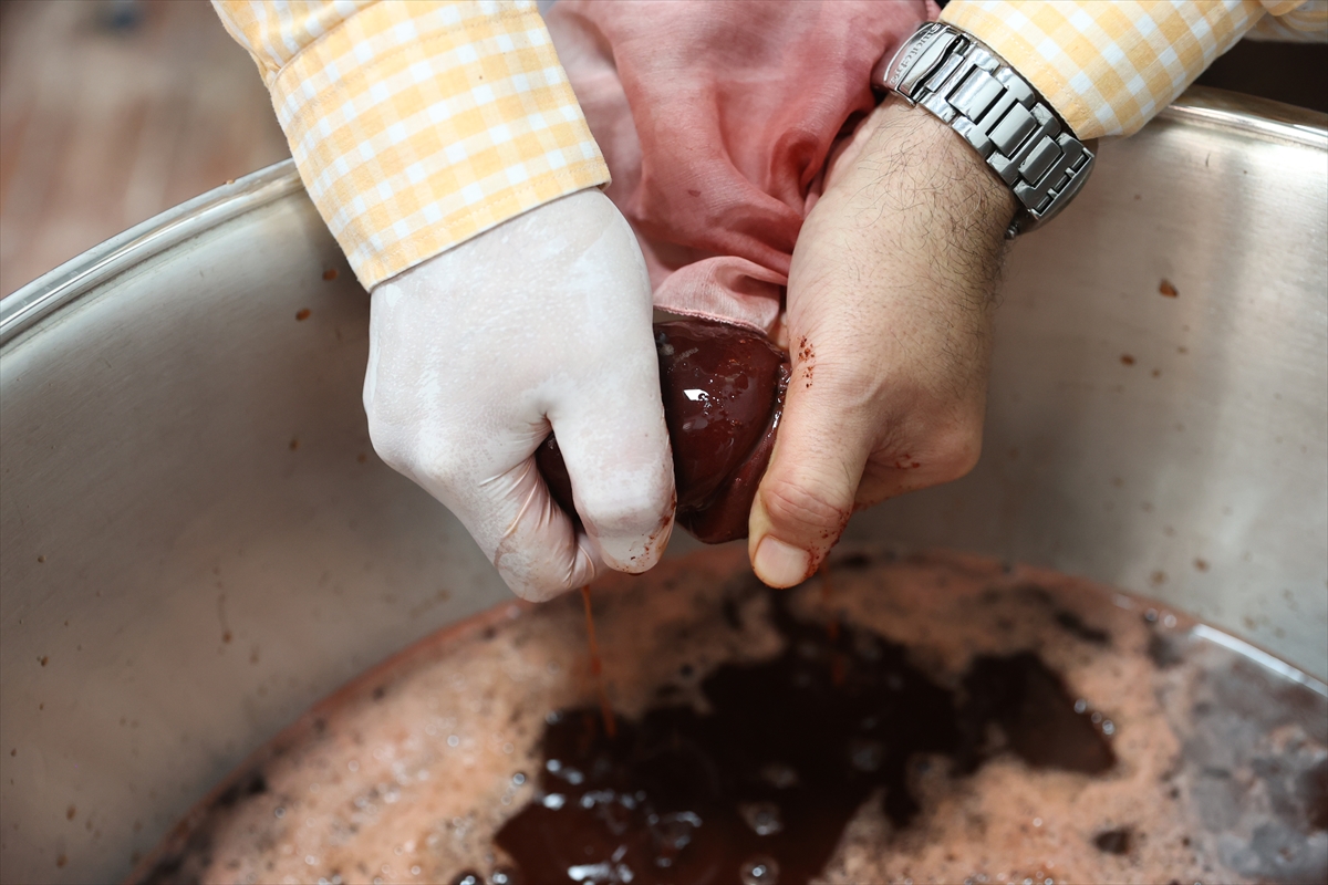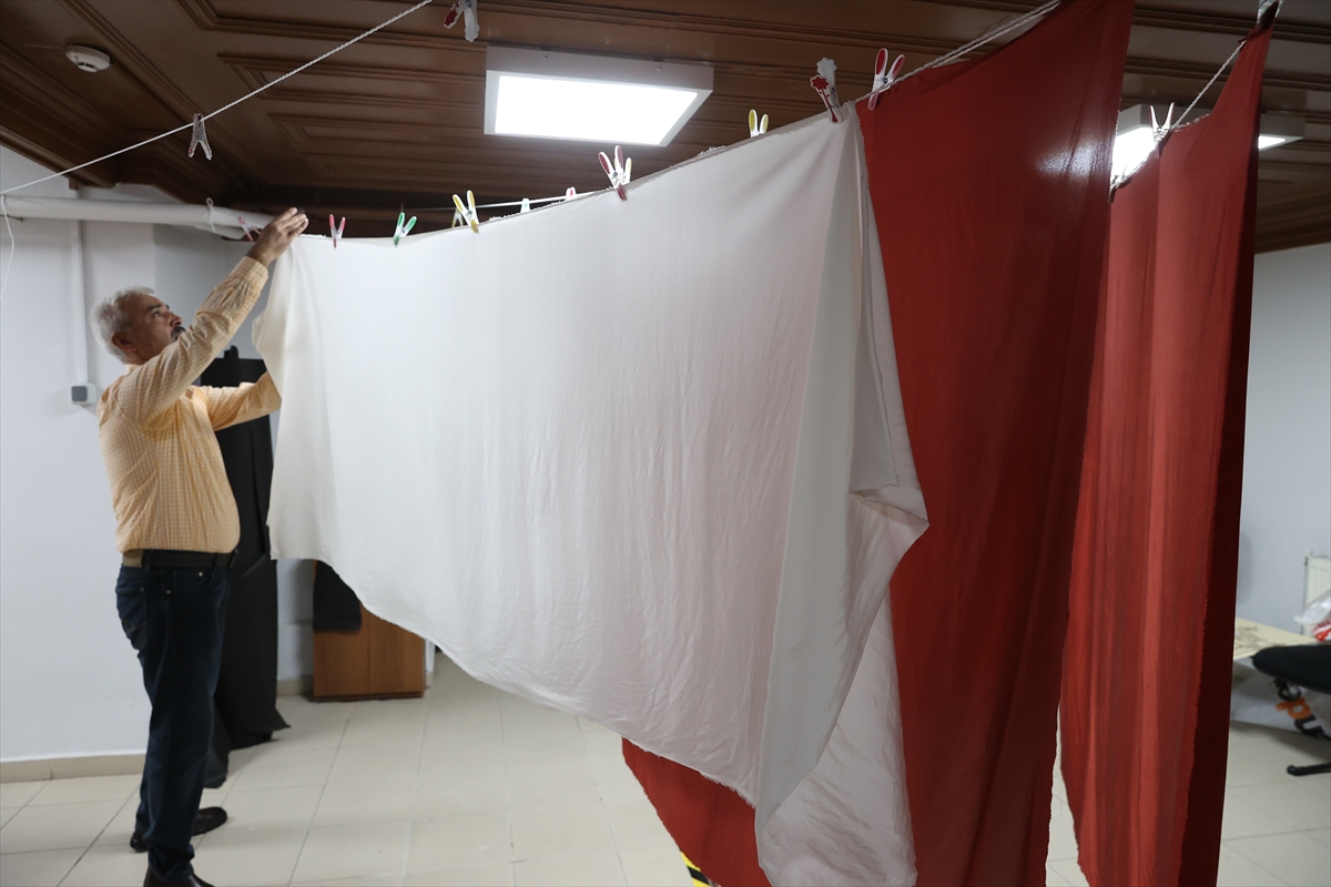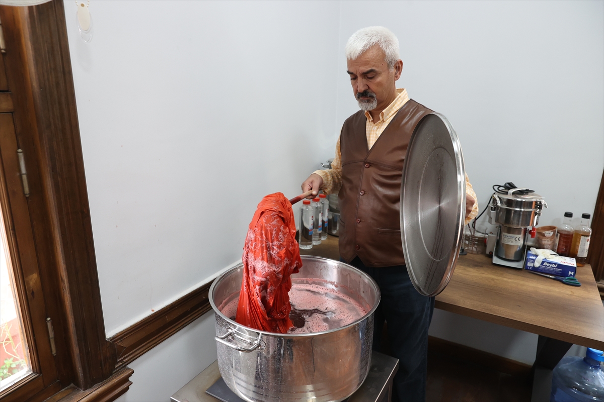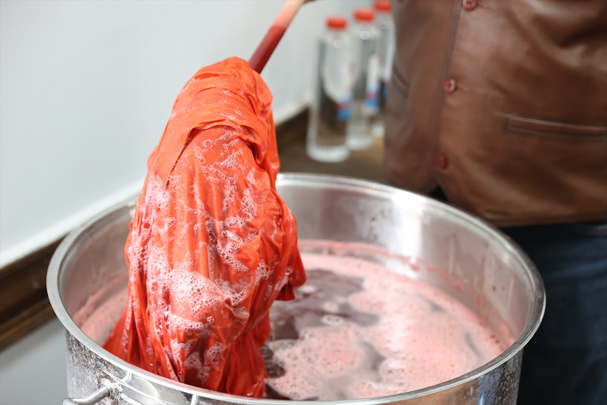 "Edirne kırmızısını reçetesini doğru uygulamak çok önemli. İpek kumaşımızı saf sabunla arıtıp sonrasında kurutuyoruz. Toz haline getirmiş olduğumuz rubia tinctorum bitkisini kazanlarda yumuşak suyla karıştırarak rengin salınmasını sağlıyoruz. Bitkisel posayı süzerek ayırıyoruz. Sonrasında da kumaşlarımızı Edirne kırmızısı rengiyle buluşturuyoruz."