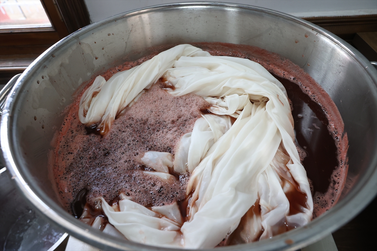 Rengin tamamen doğal yollarla elde edildiğini belirten Gazi, "Boya hazırlanırken içerisinde klorun olmadığı, pH'ın 7 seviyelerinde olduğu yumuşak su kullanıyoruz. Genelde arıtılmış su kullanıyoruz. Başarılı bir deneme de gerçekleştirdik. Yağmur suyuyla hazırladığımız karışımdan başarılı sonuç aldık. İmkanımız olduğunca yağmur suyu stoklayarak çalışmalarımızı yaptık. Yağmur yağdığı zaman kazanlarımızda su biriktiriyoruz ve kullanıyoruz." dedi.
