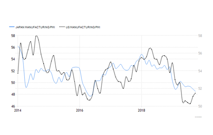 Benzer tablo, yukarıda görülebileceği üzere Japonya ve ABD imalat aktiviteleri için de karamsar seyrediyor.