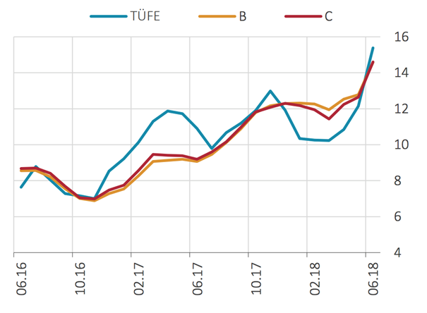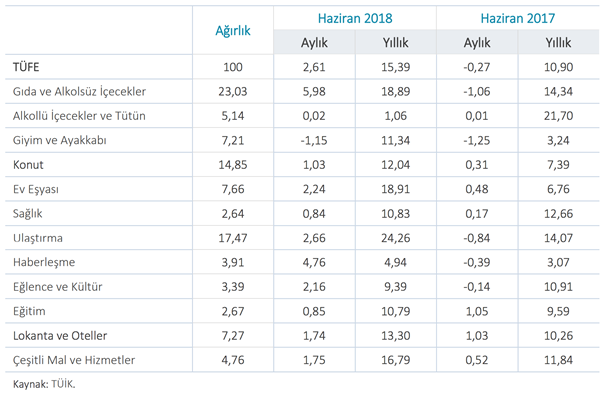 Haziran ayında tüketici fiyatları yüzde 2,61 oranında artarken; yıllık enflasyon yüzde 3,24 artarak yüzde 15,39 olarak gerçekleşti. Bu dönemde gıda, enerji, temel mal ve hizmet fiyatlarının katkısı göreceli olarak arttı. ÖKTG-B ve ÖKTG-C göstergelerinin yıllık değişim oranları yüzde 14,58 ve 14,60 olarak gerçekleşti. Söz konusu dönemde temel mal ve hizmet grubunun katkısının çekirdek enflasyon göstergelerine yansımaya devam ettiği gözlemleniyor.