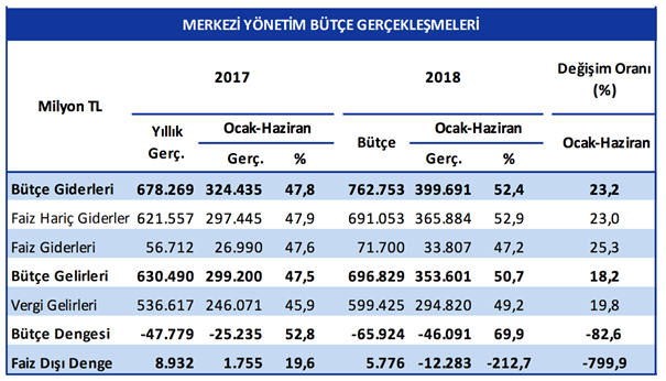 Merkezi yönetim bütçesi 2017 yılı Ocak-Haziran döneminde 25 milyar 235 milyon TL açık verirken, bu yılın aynı döneminde 46 milyar 91 milyon TL açık verdi. Aynı dönemde faiz dışı açık ise 12 milyar 283 milyon TL olarak gerçekleşti. Bütçe verilerinin söz konusu gerçekleşmesinde bütçe giderlerinde yüzde 23,2 düzeyinde artış görülürken, bütçe gelirlerinde yüzde 18,2 düzeyinde artış olması önemli rol oynadı.