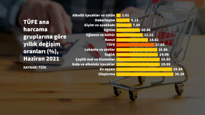 TÜİK verilerine göre bir önceki yılın aynı ayına göre artışın yüksek olduğu ana gruplar ise sırasıyla, yüzde 26,29 ile ulaştırma, yüzde 25,69 ile ev eşyası ve yüzde 19,99 ile gıda ve alkolsüz içecekler oldu.