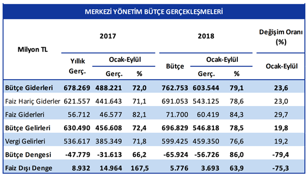 Bütçe verilerinin söz konusu gerçekleşmesinde bütçe giderlerinde yüzde 23,6 düzeyinde artış görülürken, bütçe gelirlerinde yüzde 19,8 düzeyinde artış olması önemli rol oynadı. Faiz giderlerinde 2018 yılı Ocak-Eylül döneminde yüzde 29,7 artış gerçekleşirken, faiz dışı giderlerdeki artış oranı yüzde 23,0 oldu.