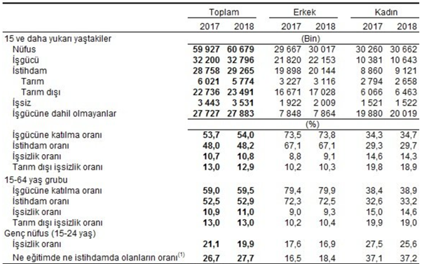 TÜİK tarafından açıklanan verilere göre Temmuz ayı itibariyle işsizlik oranı yüzde 10,8 seviyesinde gerçekleşti. Bu dönemde işsiz sayısı 3 milyon 531 bin kişi iken, işsizlik oranı erkeklerde yüzde 9,1; kadınlarda ise yüzde 14,3 oldu. Aynı dönemde tarım dışı işsizlik oranı yüzde 13,0 olarak tahmin edildi. İşgücü söz konusu dönemde 32 milyon 796 bin kişi, işgücüne katılma oranı ise yüzde 54,0 olarak gerçekleşti. İşgücüne katılma oranı erkeklerde yüzde 73,8; kadınlarda ise yüzde 34,7 oldu.