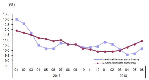 Grafik: Mevsim etkilerinden arındırılmış işsizlik oranı, TEMMUZ 2018