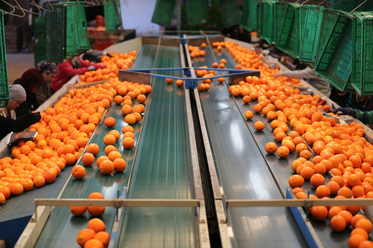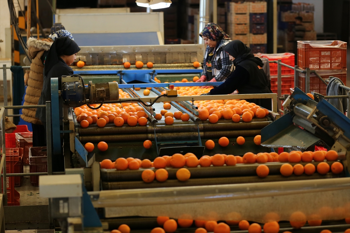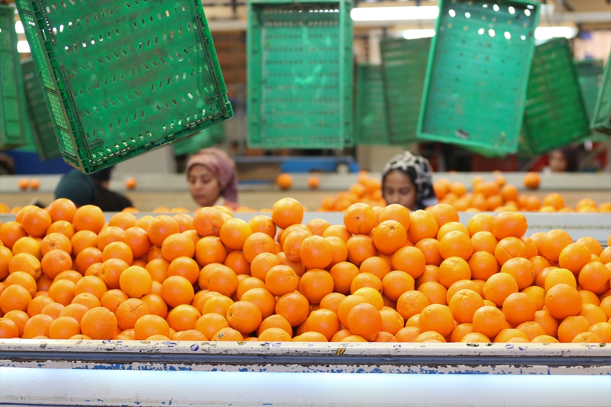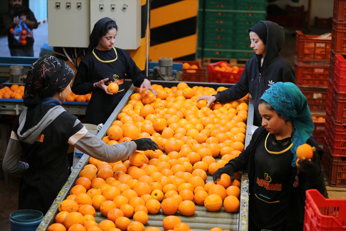 Mart sonuna kadar sürmesi beklenen hasat döneminde bahçelerden kasalarla traktörlere yüklenen portakallar, ilçedeki tesislerde yıkanıp paketlendikten sonra naklediliyor.
