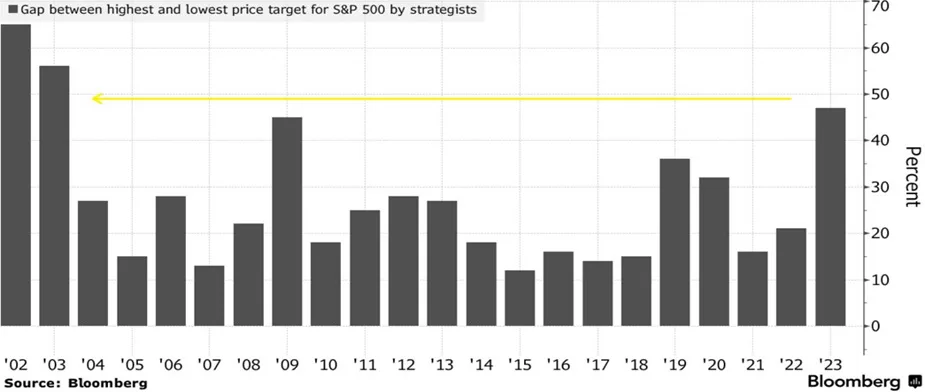 We may see more volatility across different asset classes if the divergence in views amongst market players persist. For instance, as of March 24th the difference between the highest and lowest year-end targets by strategists for SP500 is at 47%, the widest at this time of year in two decades, as per the data compiled by Bloomberg illustrates below.