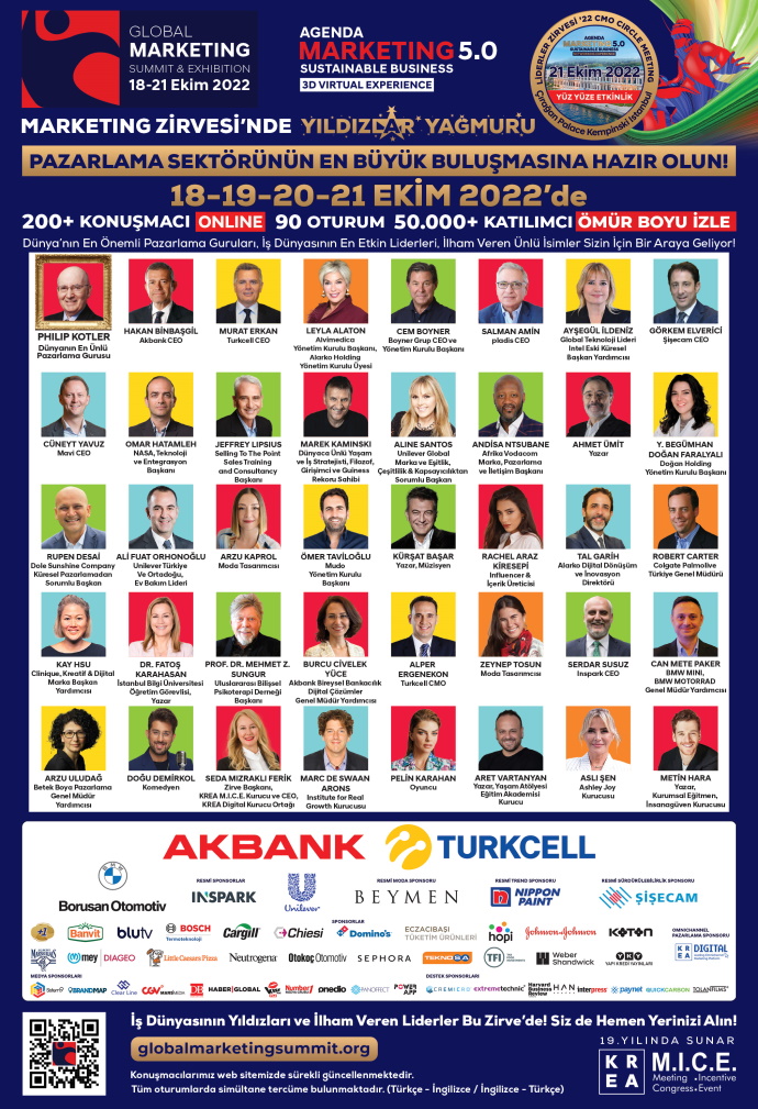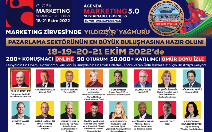 -Akbank ve Turkcell ana sponsorluğunda 18-21 Ekim 2022 tarihlerinde gerçekleşecek Global Marketing Summit, 3D Virtual Reality Online olarak 4 gün boyunca dünyanın en önemli pazarlama guruları, iş dünyasının en etkin liderleri ve ilham veren ünlü isimleri bir araya getirecek.