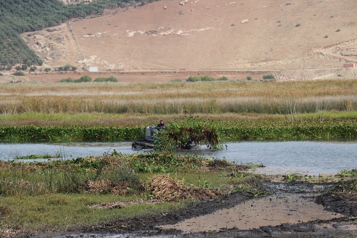 Türkiye Sürdürülebilir İnsani Yardım ve Eğitim Vakfı ile Hatay Büyükşehir Belediyesi işbirliğinde hayata geçirilen "Gölbaşı Gölü Rehabilitasyonu ve Su Sümbüllerinin Geri Dönüşümü Yoluyla Yerel Ekonomiye Katkı Projesi" kapsamında gölün yüzeyini kaplayan su sümbülleri, amfibi aracıyla toplanıyor.