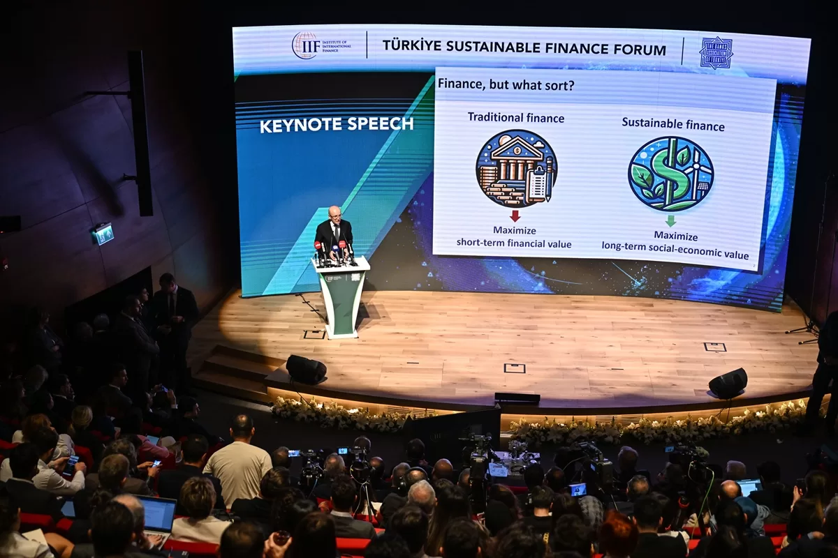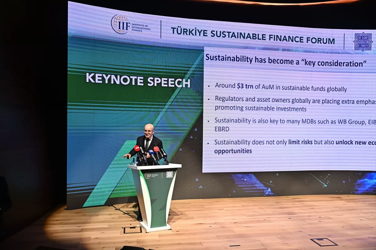 Şimşek, Uluslararası Finans Enstitüsü (IIF) ve Türkiye Bankalar Birliği (TBB) iş birliğiyle, İstanbul Finans Merkezi Ziraat Bankası Genel Müdürlük Oditoryumu’nda düzenlenen “Türkiye Sürdürülebilir Finans Forumu”nda konuştu.