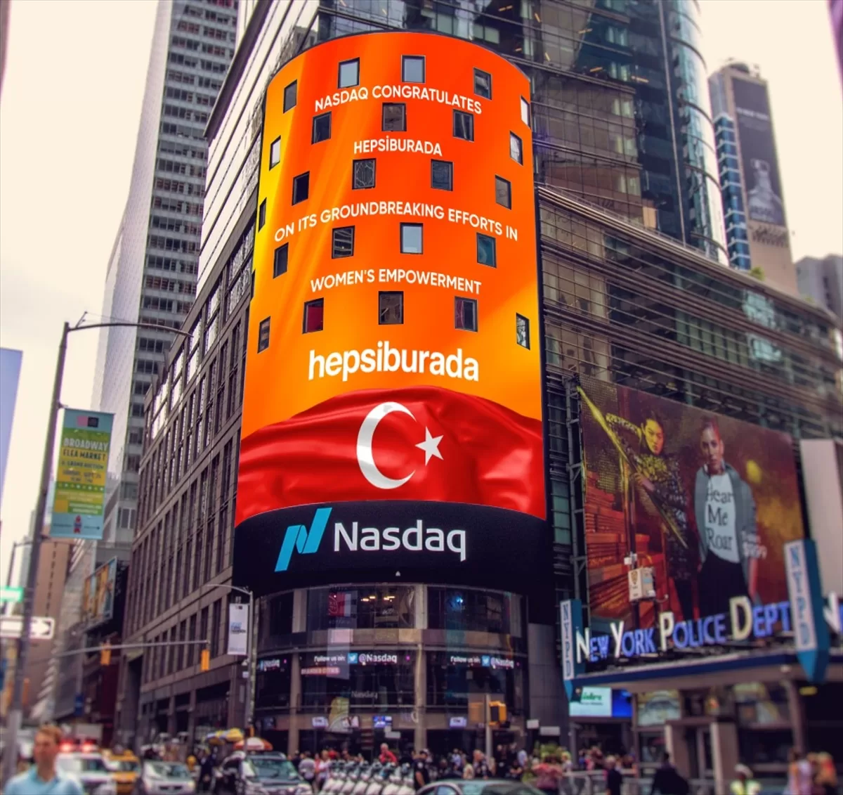 Nasdaq borsası da Hepsiburada'nın kadın girişimcilere verdiği desteği kutladı. Nasdaq borsasının Times Meydanı'ndaki dijital panolarında Hepsiburada ve Türk bayrağı görselleri yer aldı.