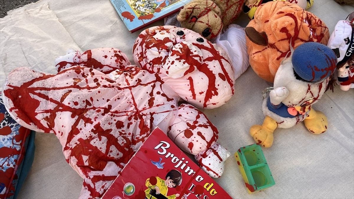 Kırmızı boyayla boyanmış çocuk oyuncakları, hikaye kitapları ve ayakkabıları hükümet binası önüne bırakan aktivistler, "Enlight Renewable Energy ile işbirliğini bitirin! Soykırımı desteklemeyin!" yazılı büyük bir pankart da açtı.
