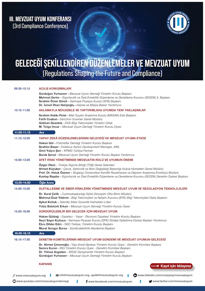 Mevzuat Uyum Derneği (Compliance Association) ve III. Mevzuat Uyum Konferansı ile ilgili detaylı bilgiye www.mevzuatuyum.org adresinden ulaşılabilir ve katılım için kayıt yapılabilir.