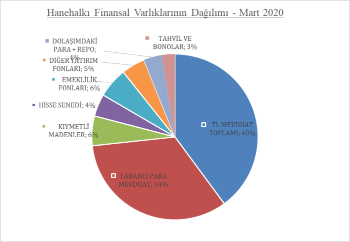 Öncelikle Mayıs 2020’de yayınlanmış olan TCMB Finansal İstikrar Raporu’nda yer alan hanehalkı finansal varlıklarının dağılımına bir göz atalım.