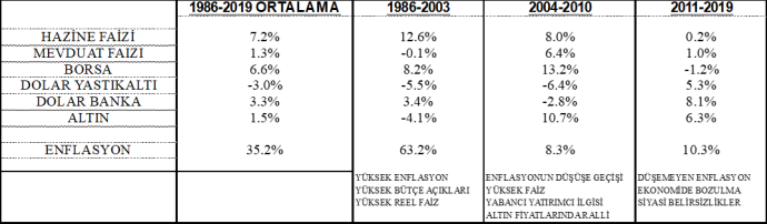 1986-2019 DÖNEMİNDE EN YÜKSEK REEL GETİRİYİ YILLIK YÜZDE 7.25 İLE HAZİNE BONOLARI GETİRDİ