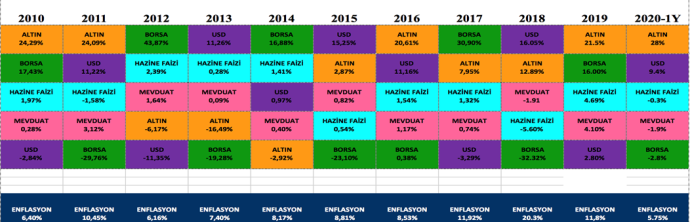 Döviz ve altın 2011-2019 arasında yüksek reel getiriler ürettiler, bu trend 2020 yılının ilk yarısında da devam etti. Bu yarıda hazine bonoları ve mevduat getirileri enflasyonun altında kaldı, hisse senetlerinin reel getirisi de negatif oldu.