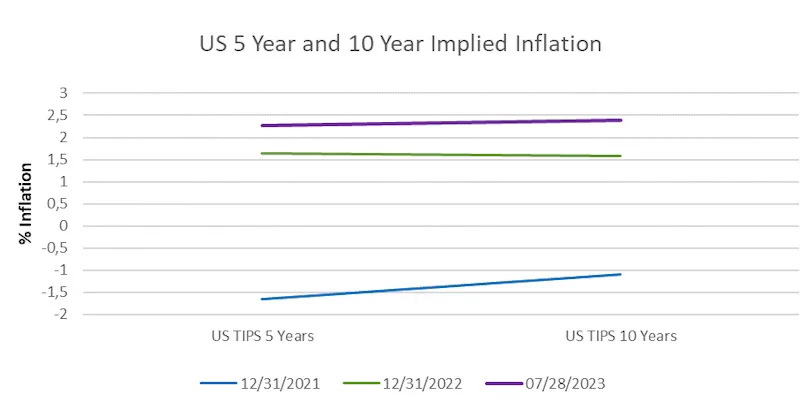 To get a better sense of how the market sentiment changed in rates once again let’s take a look at how the bond markets’ 5 and 10 year inflation expectations moved since late 2021 as illustrated in the chart below. As our readers may remember from our previous issues, the data points below are calculated using the US yield curve which represent the nominal rates and the US Treasury Inflation-Protected Securities (“TIPS”) which represent the real rates. Taking the difference between the two (i.e. nominal interest rates – real interest rates = expected inflation) then gives the implied (or breakeven) inflation that is expected by the markets.