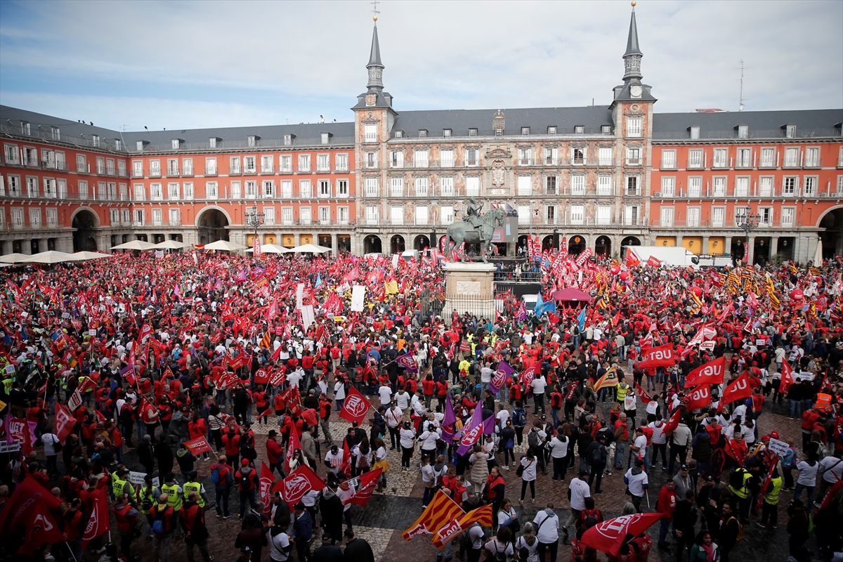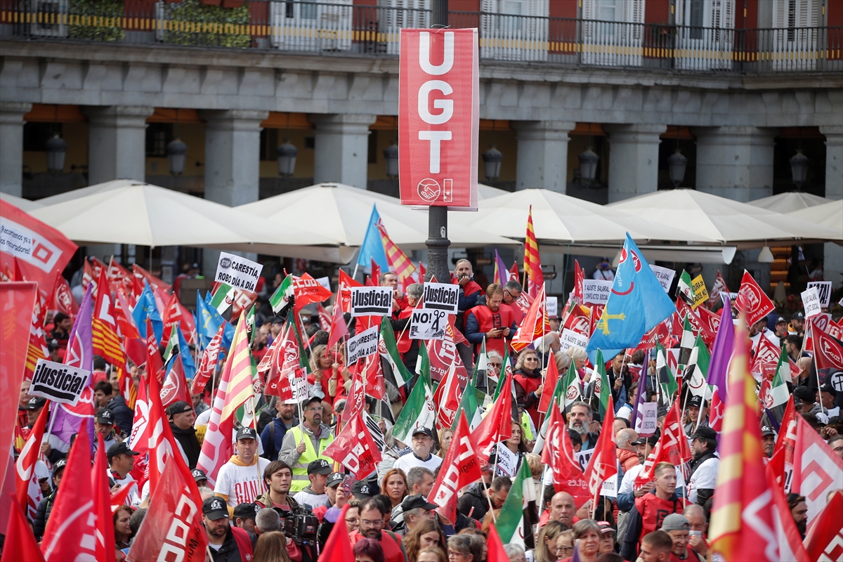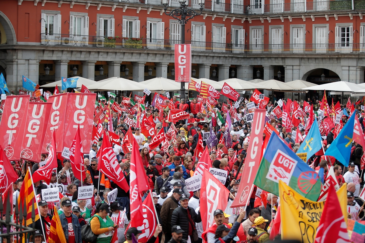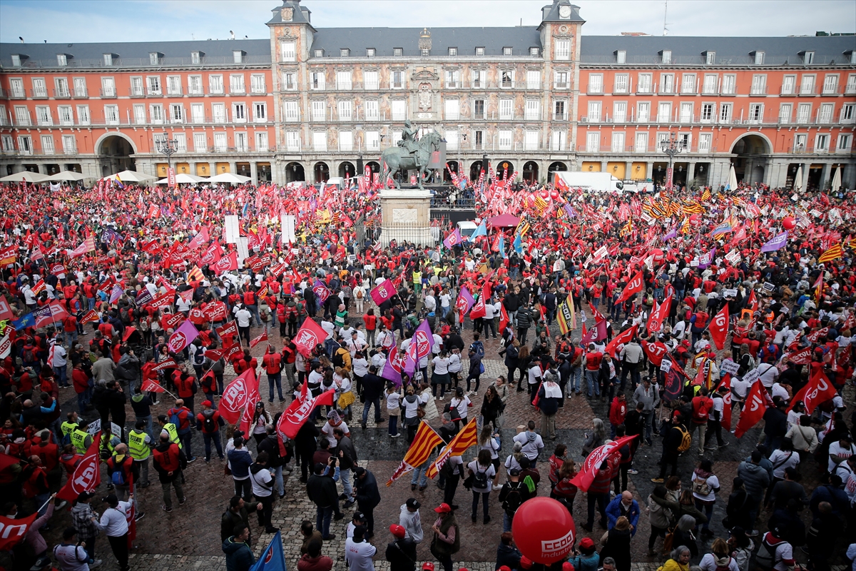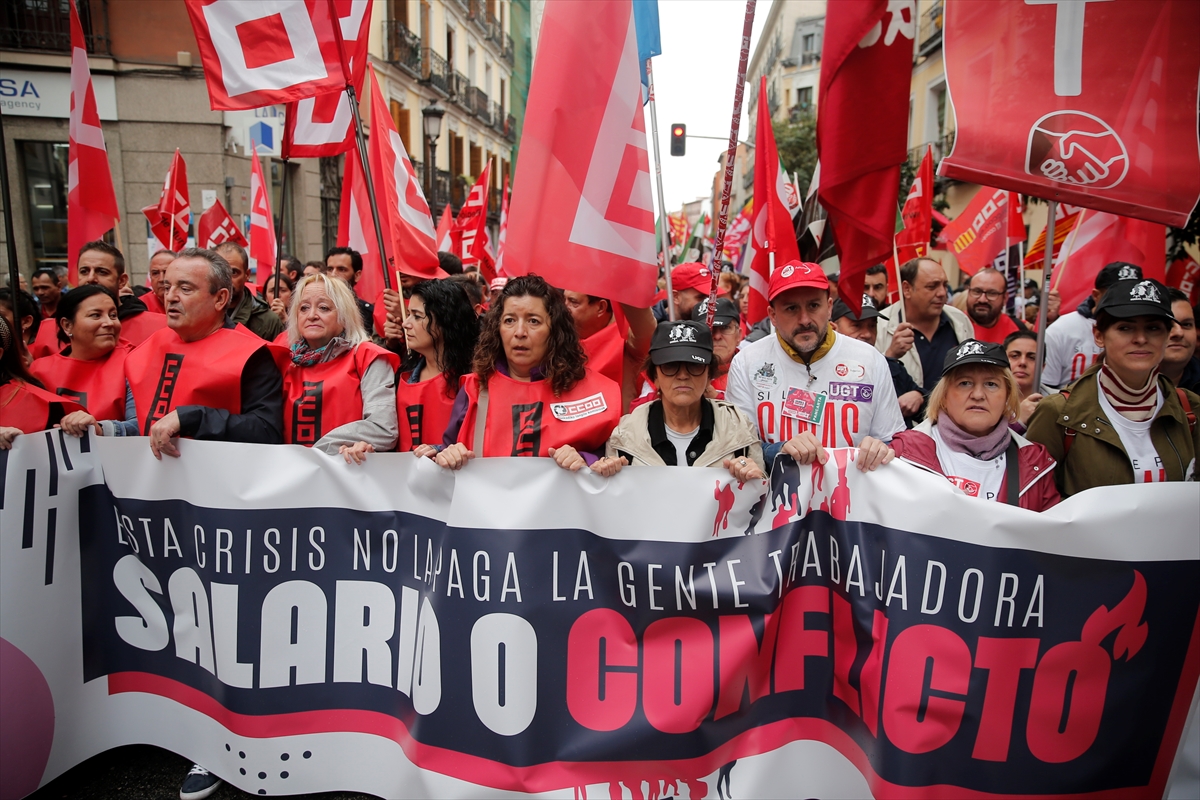 İşçi Komisyonları Sendikası (CCOO) ve Genel İşçi Sendikasının (UGT) çağrısıyla ülkenin dört yanından Madrid'e gelen işçiler, "Bu krizin faturasını işçi sınıfı ödemeyecek" ve "Ya maaş artışı, ya çatışma" şeklinde sloganlar attı.