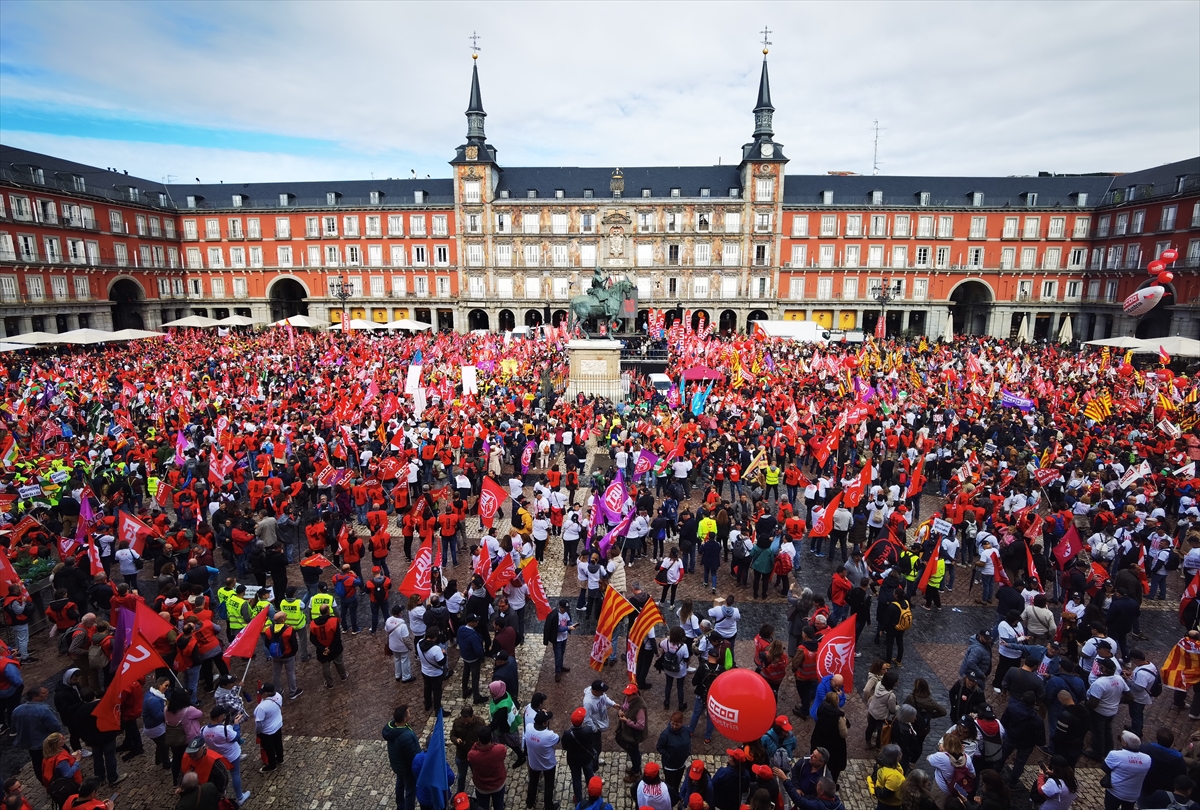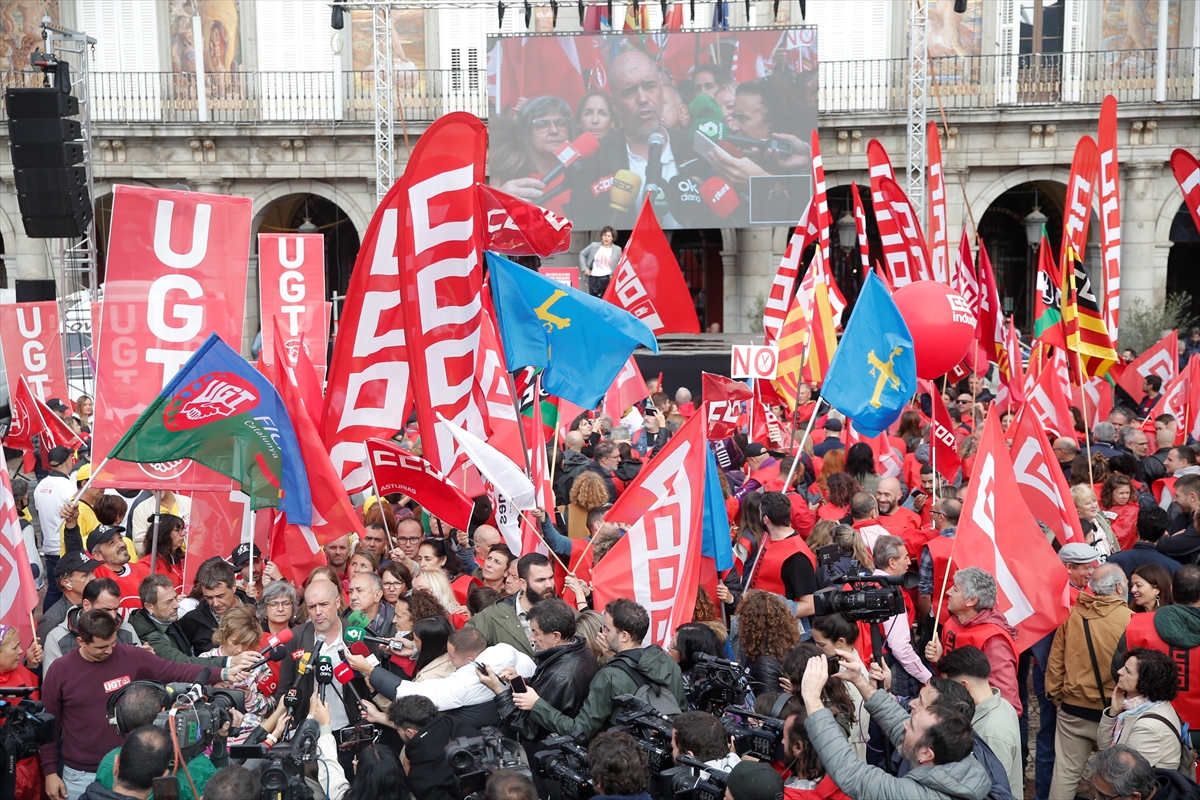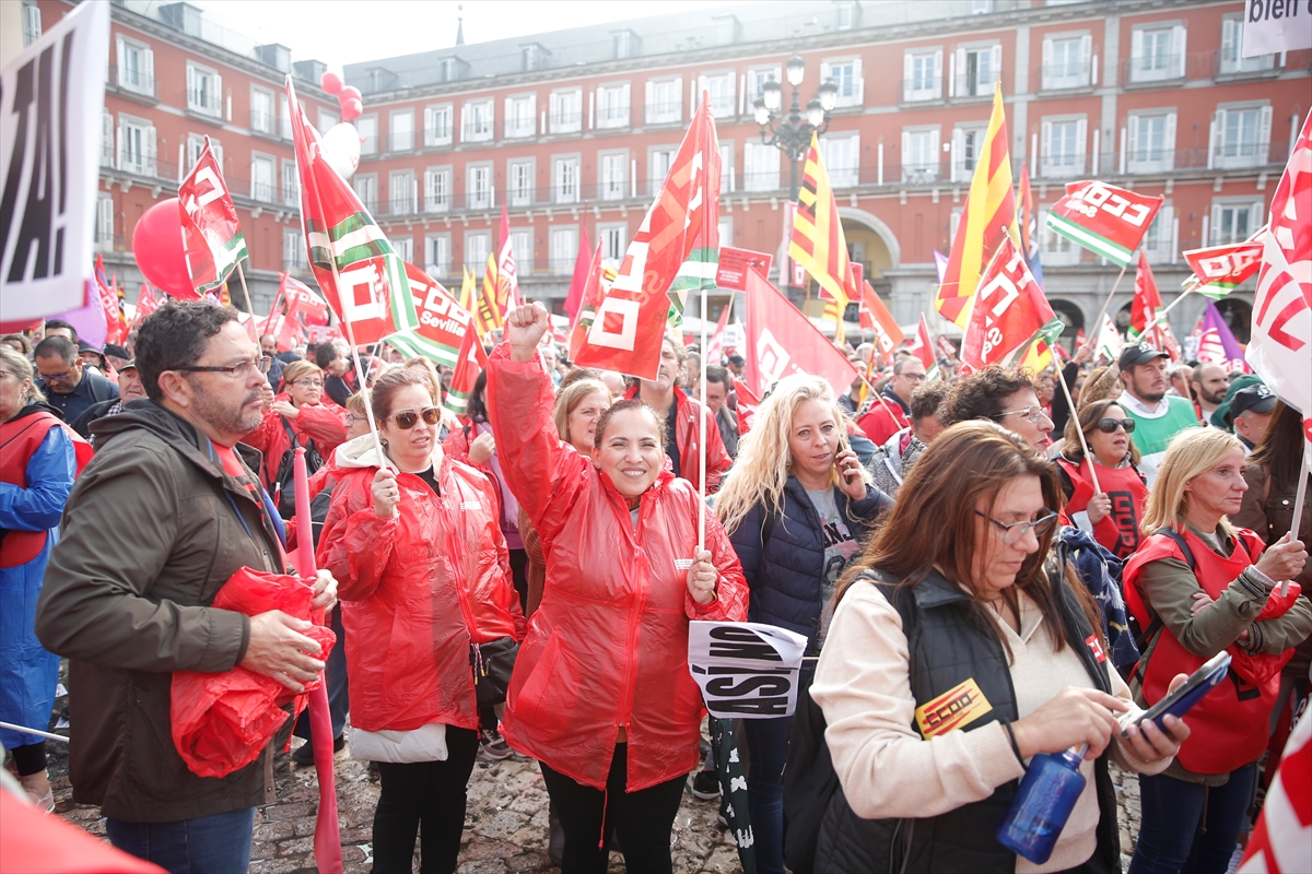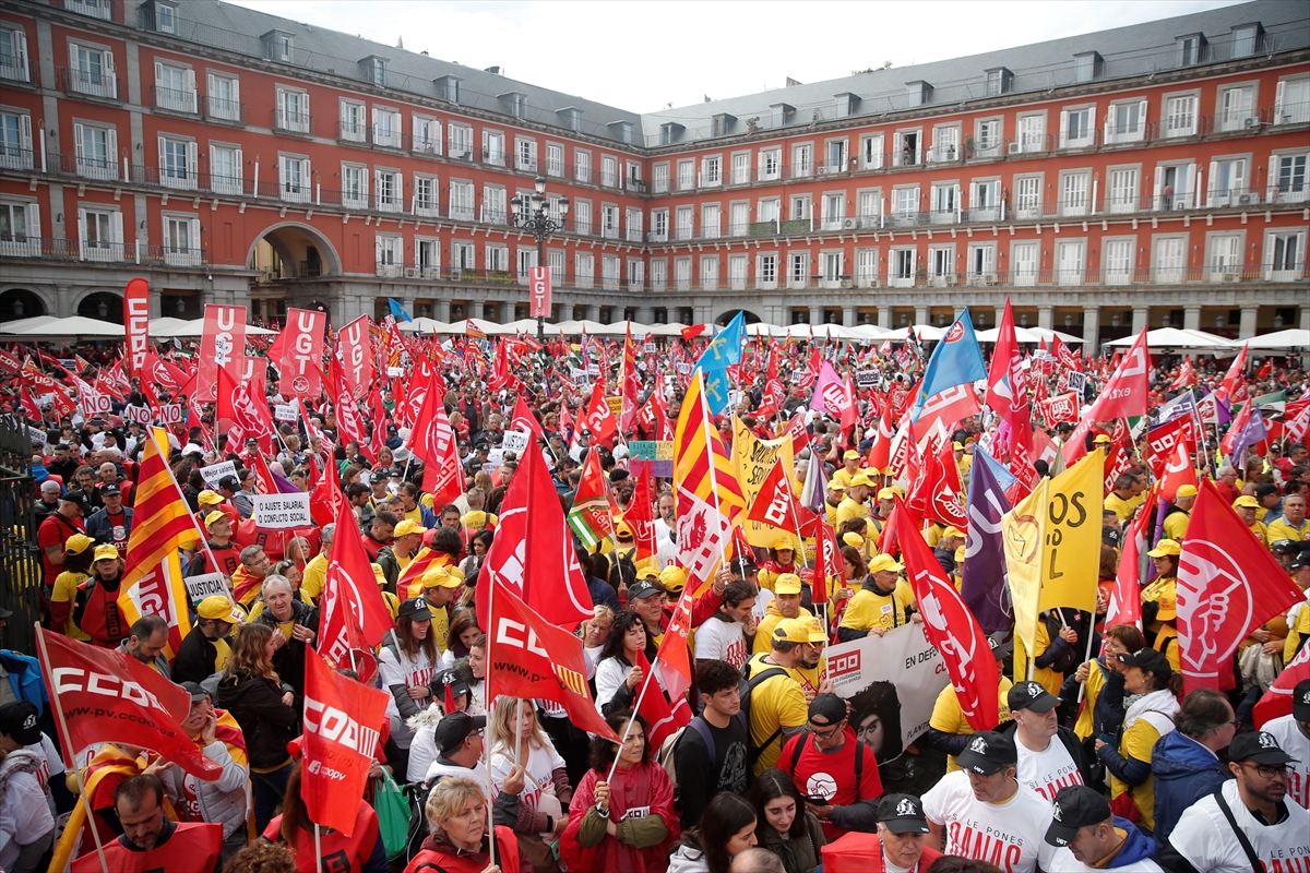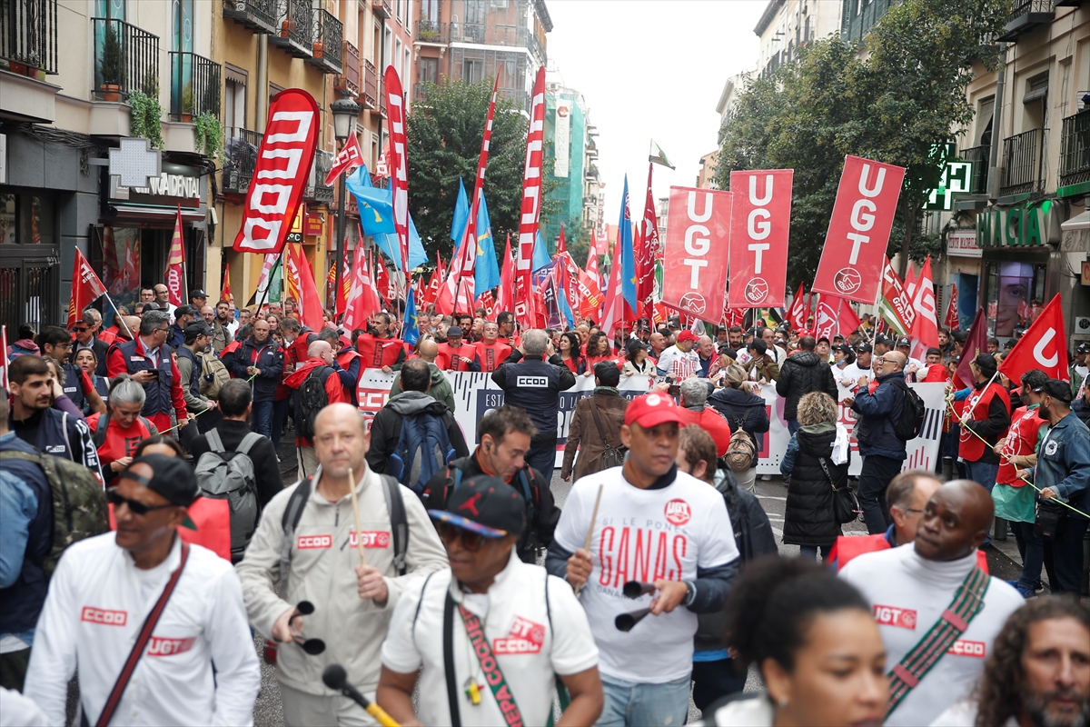 İşçi Komisyonları Sendikası (CCOO) ve Genel İşçi Sendikasının (UGT) çağrısıyla ülkenin dört yanından Madrid'e gelen işçiler, "Bu krizin faturasını işçi sınıfı ödemeyecek" ve "Ya maaş artışı, ya çatışma" şeklinde sloganlar attı.