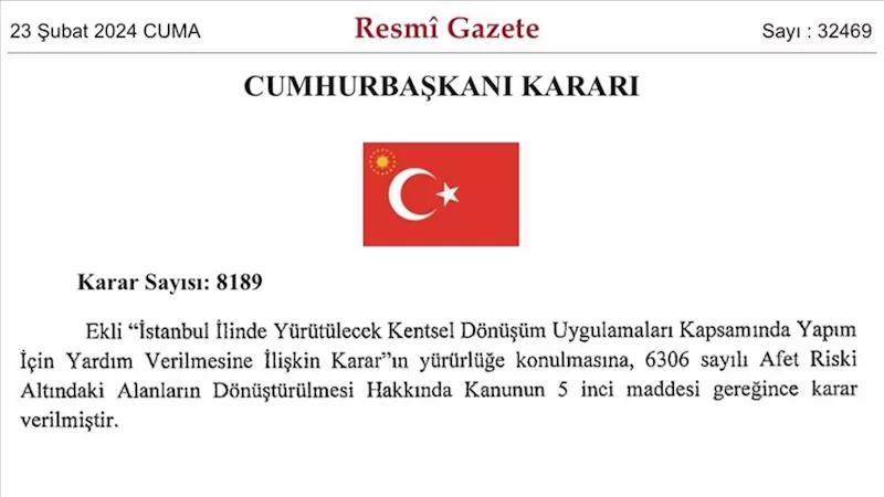 İstanbul’da yürütülecek kentsel dönüşüm uygulamaları kapsamında yapım için yardım verilmesine ilişkin Cumhurbaşkanı Kararı Resmi Gazete’de yayımlanarak yürürlüğe girdi.
