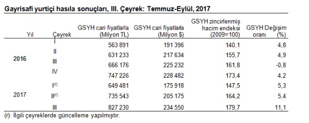 Üretim yöntemiyle gayrisafi yurtiçi hasıla tahmini, 2017 yılının üçüncü çeyreğinde cari fiyatlarla yüzde 24,2 artarak 827 milyar 230 milyon TL oldu. Gayrisafi yurtiçi hasılayı oluşturan faaliyetler incelendiğinde; 2017 yılının üçüncü çeyreğinde bir önceki yılın aynı çeyreğine göre zincirlenmiş hacim endeksi olarak; tarım sektörü toplam katma değeri yüzde 2,8, sanayi sektörü yüzde 14,8 ve inşaat sektörü yüzde 18,7 arttı. Ticaret, ulaştırma, konaklama ve yiyecek hizmeti faaliyetlerinin toplamından oluşan hizmetler sektörünün katma değeri ise yüzde 20,7 arttı. Takvim etkisinden arındırılmış GSYH zincirlenmiş hacim endeksi, 2017 yılı üçüncü çeyreğinde bir önceki yılın aynı çeyreğine göre yüzde 9,6 arttı. Mevsim ve takvim etkilerinden arındırılmış GSYH zincirlenmiş hacim endeksi, bir önceki çeyreğe göre yüzde 1,2 arttı.