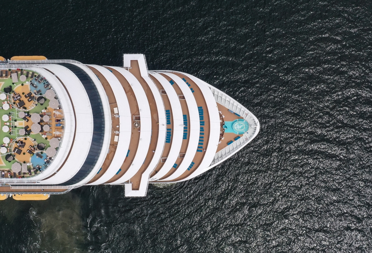 İçinde lüks otel konforunda 2 bin 116 kamara bulunan 135 bin tonluk turistik gezinti gemisinin yolcularını İzmir Limanı'nda halk oyunları ekibi ve bando karşıladı.