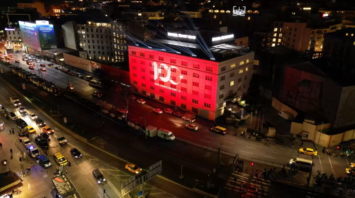Görsel şölen kapsamında Oda'nın merkez binasına yansıtılan Türk bayrağı, İTO ve 100. yıl logoları ile "Çok Yaşa Cumhuriyet" sloganı, Cumhuriyetin 100. yılı kutlama etkinliklerine eşlik ediyor.