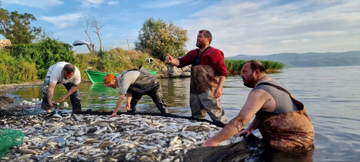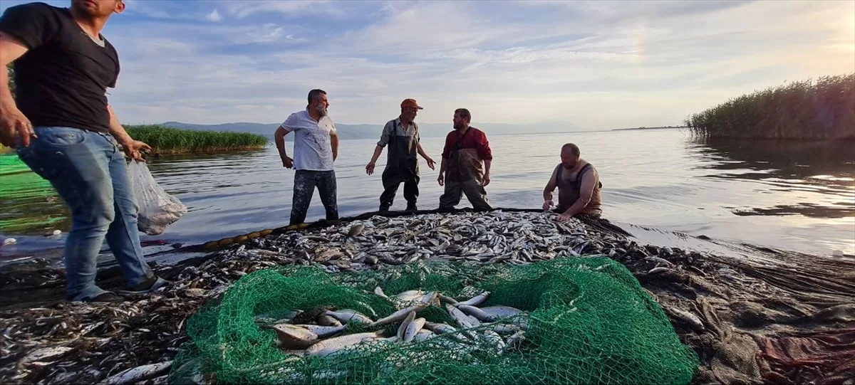 Bursa'nın İznik ilçesinden tekneleriyle göle açılan balıkçılar, suya bıraktıkları ağlarıyla yüzlerce kilogram sazan ve levkit avladı. Balıkçılar, kıyıda topladıkları ağın içinde satışına izin verilen büyüklükte olan balıkları kasalara doldurdu, diğerlerini göle geri bıraktı.