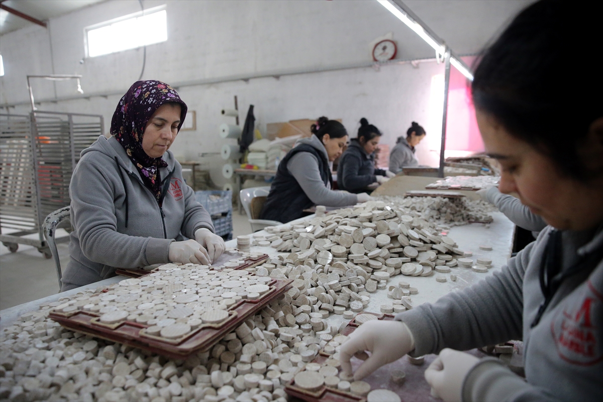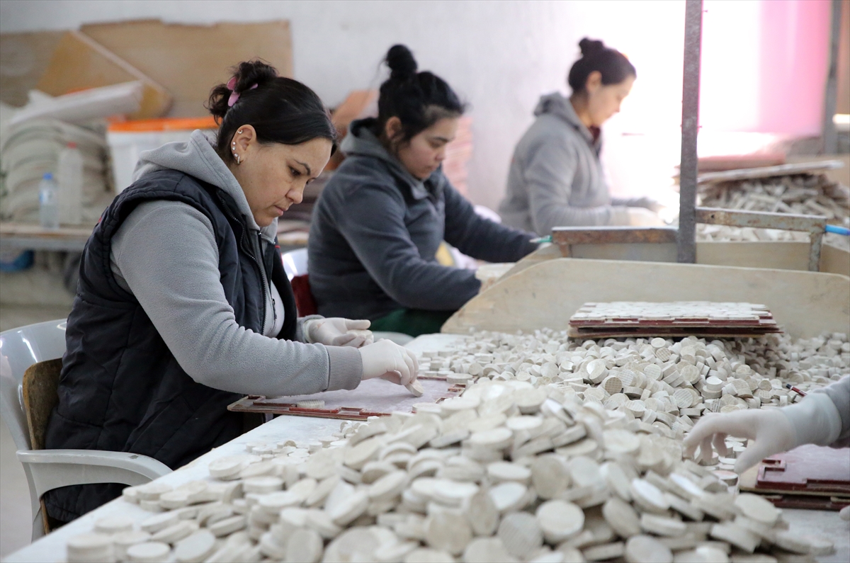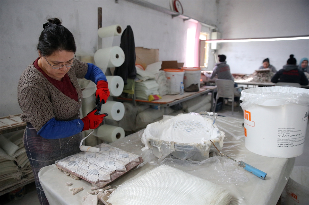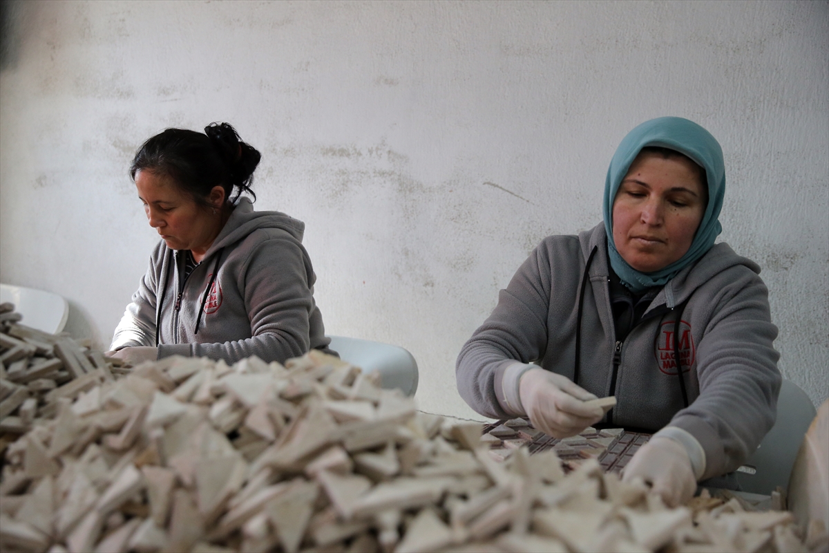 Fabrikanın gürültüsünden taktıkları kulaklık, tozundan ise ağızlarını kapattıkları eşarplar ve maskelerle korunan kadınlar, ince işçiliğin gerektiği mozaik yapıştırma ve satışa hazır hale gelen ürünlerin son kontrollerini de yapıyor.