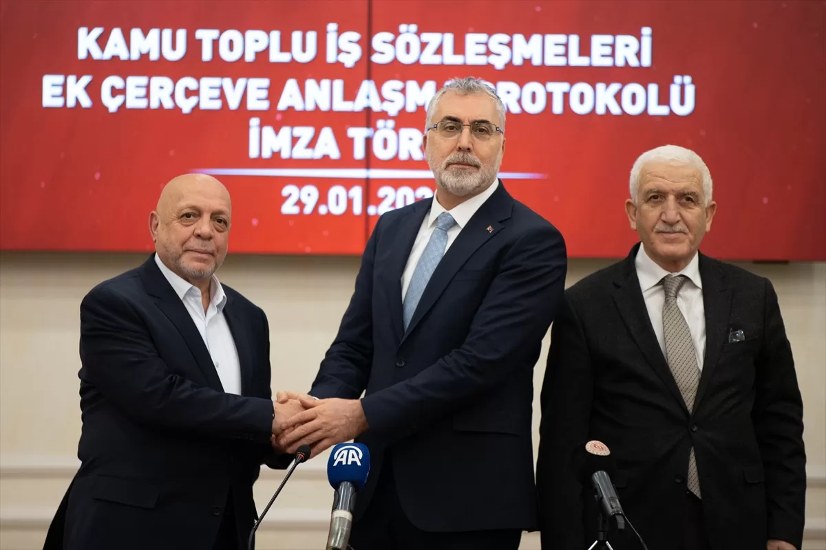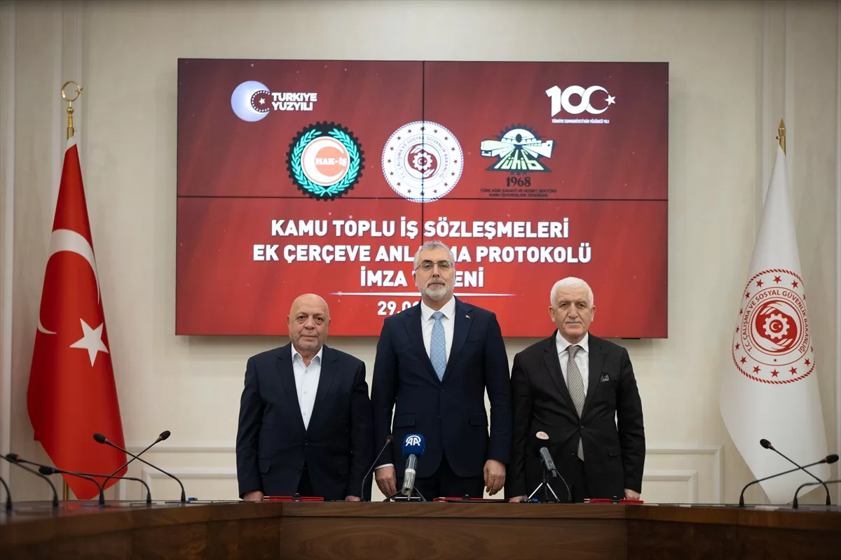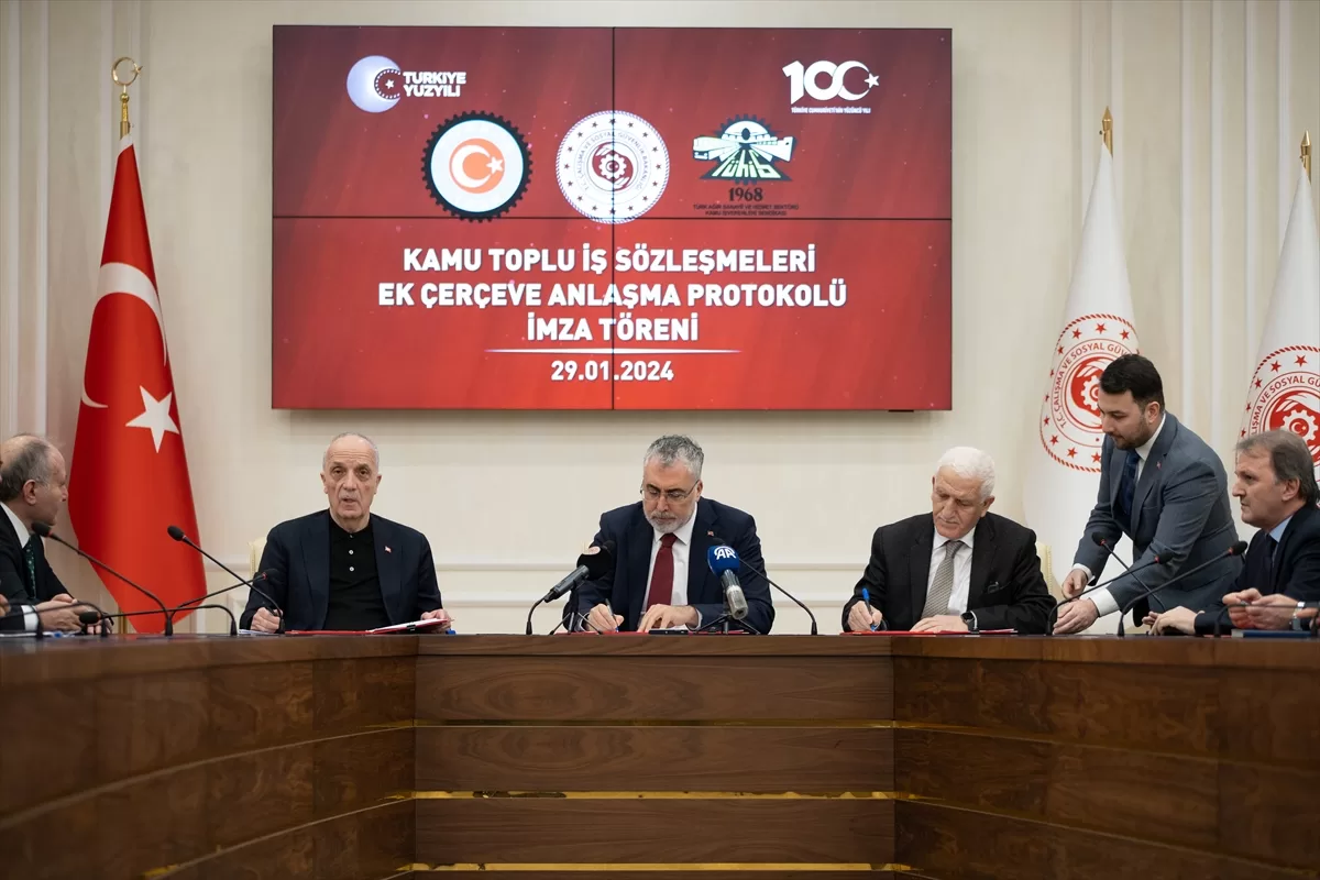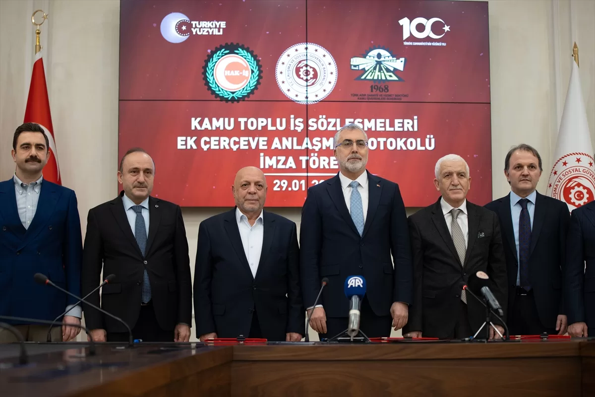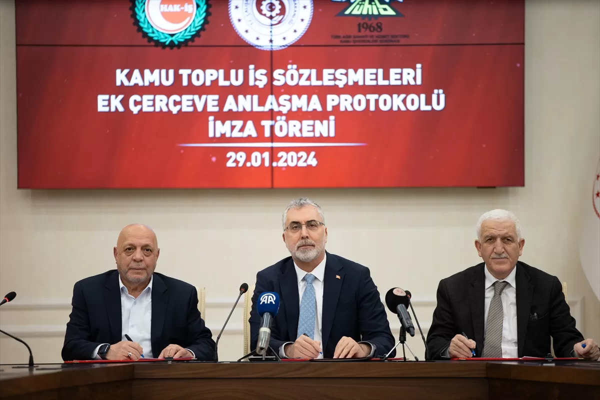 ANKARA (AA) – Çalışma ve Sosyal Güvenlik Bakanlığı koordinasyonunda, TÜRK-İŞ ve HAK-İŞ ile Türk Ağır Sanayii ve Hizmet Sektörü Kamu İşverenleri Sendikası (TÜHİS) arasında "Kamu Toplu İş Sözleşmeleri Ek Çerçeve Anlaşma Protokolü" imzalandı.