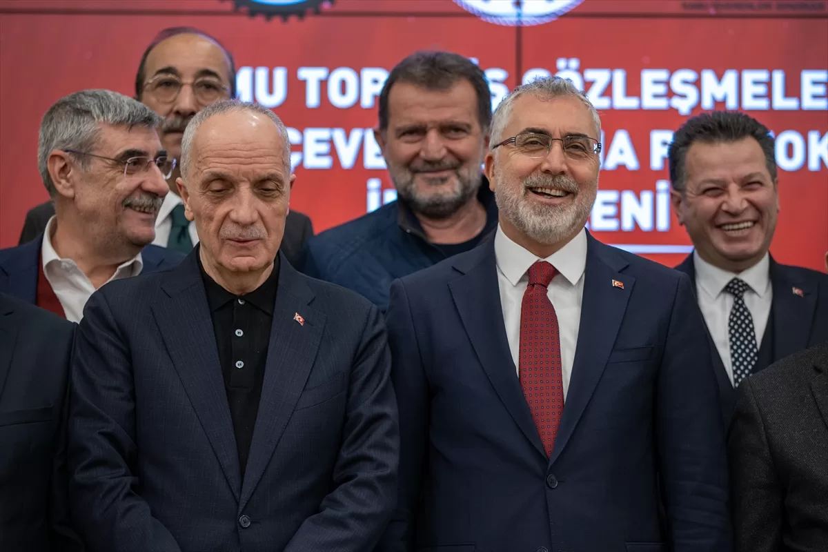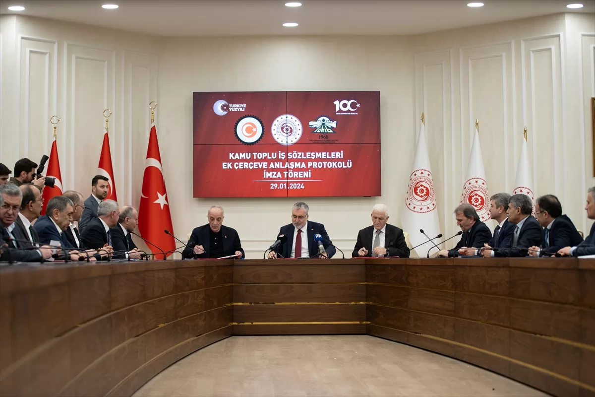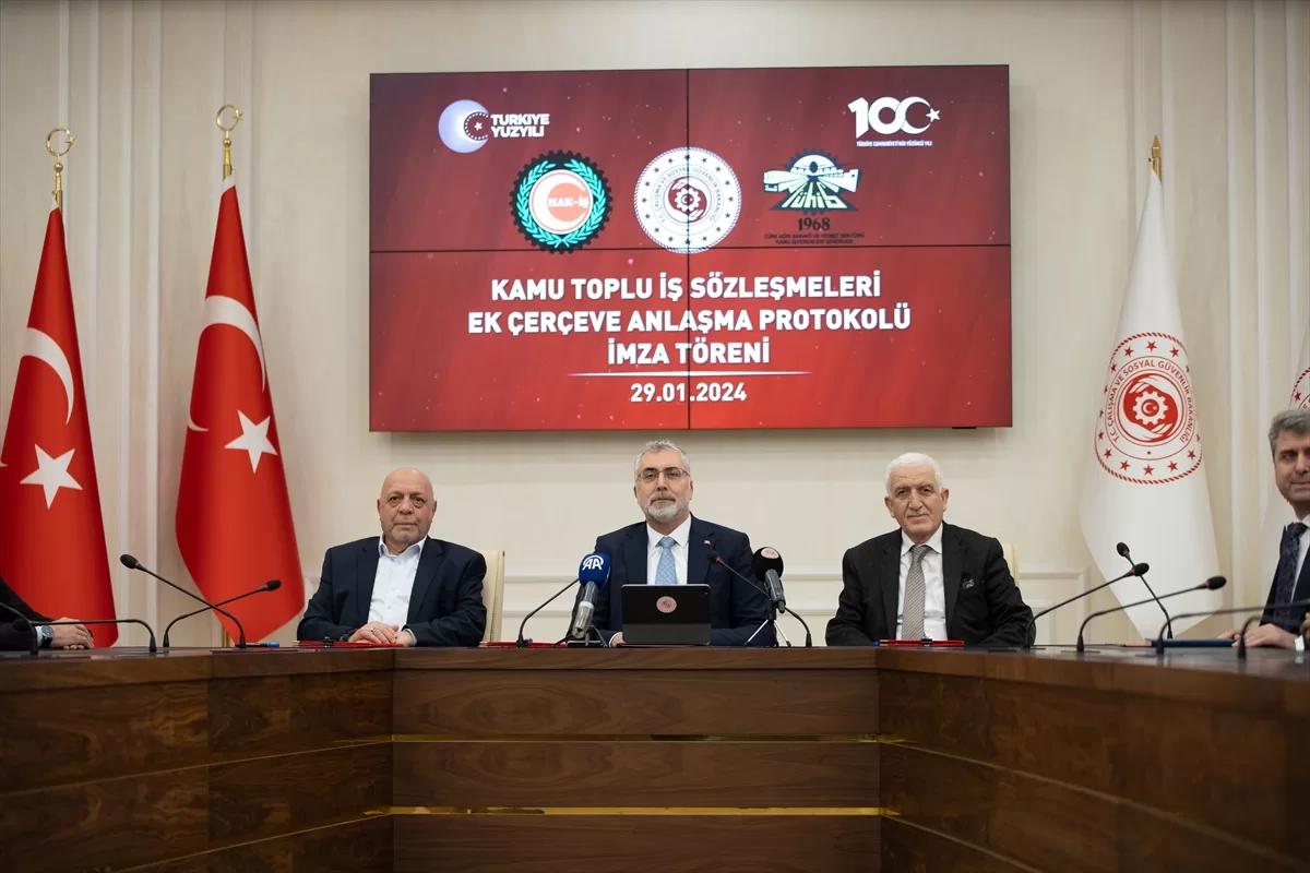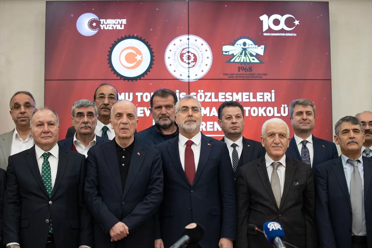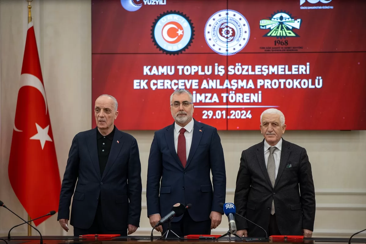 ANKARA (AA) – Çalışma ve Sosyal Güvenlik Bakanlığı koordinasyonunda, TÜRK-İŞ ve HAK-İŞ ile Türk Ağır Sanayii ve Hizmet Sektörü Kamu İşverenleri Sendikası (TÜHİS) arasında "Kamu Toplu İş Sözleşmeleri Ek Çerçeve Anlaşma Protokolü" imzalandı.