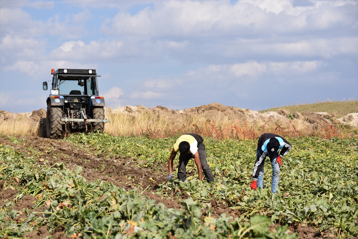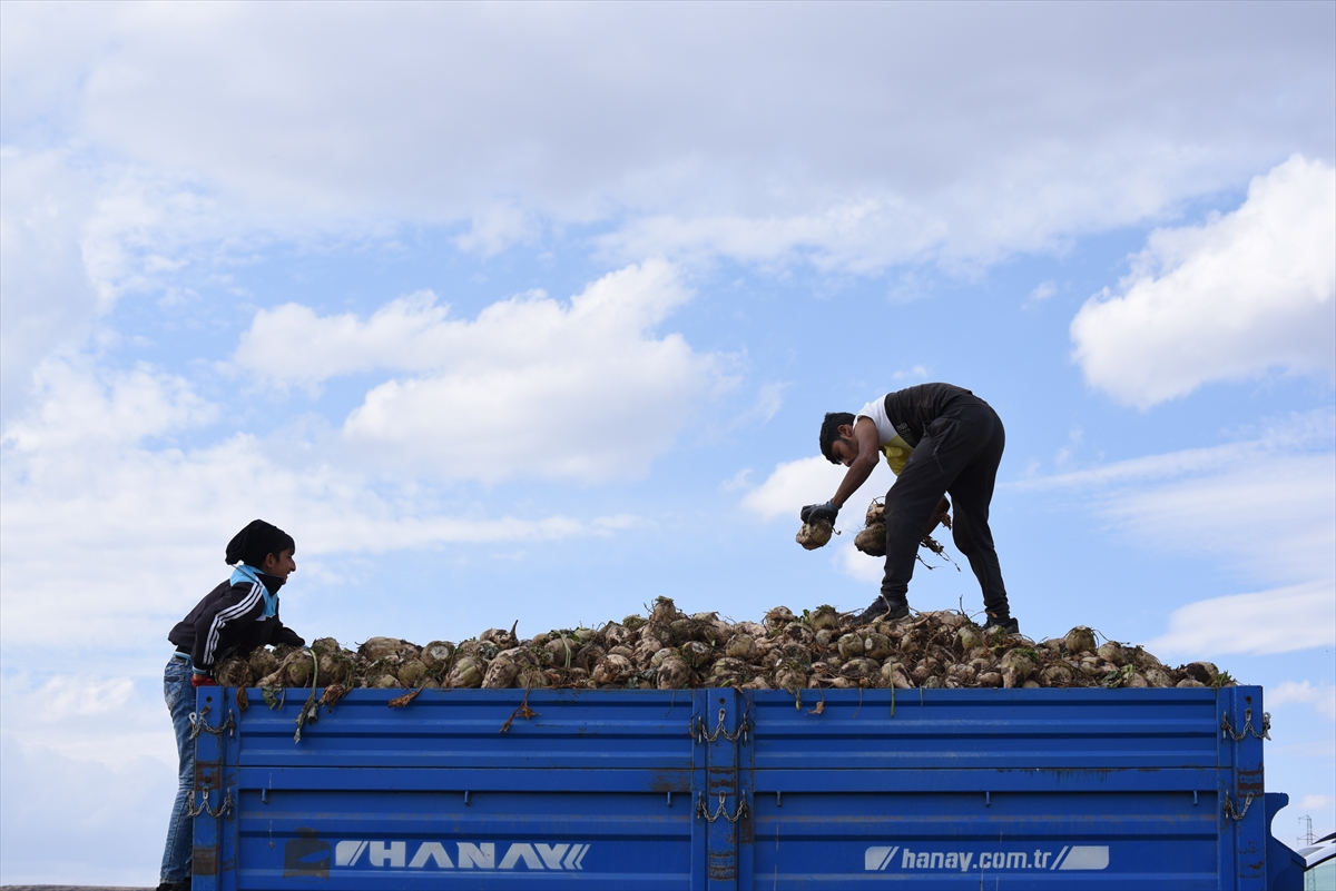 İlkbaharda bölgede etkili olan yağışlar sayesinde verimli bir sezon geçiren çiftçiler, tarlalarda tarım makineleriyle pancar sökümü yapıyor.