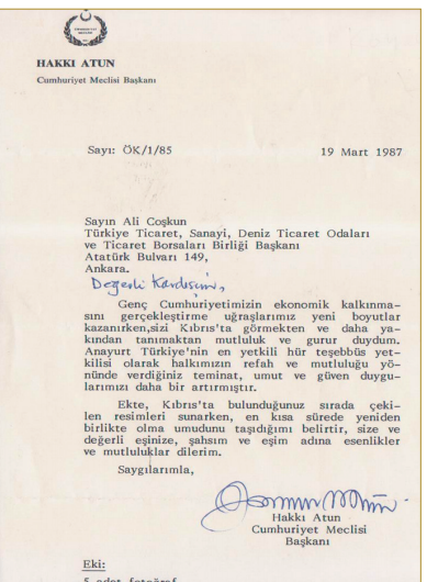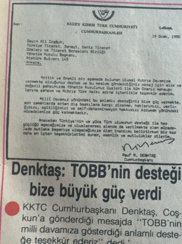 Hür teşebbüs olarak devletimizin yanında olma ve Kıbrıs’a sahip çıkma yönünden TOBB (Türkiye Odalar Borsalar Birliği) Başkanlığım sırasında (25 Şubat 1987) yüzü aşkın iş adamıyla birlikte Rumları çıldırtan askeri zaferimizi tamamlayan ekonomik zafer çıkartmamızın yer alması uzun süre Rauf Denktaş’ın ve Hakkı Altun’un mektuplarında veciz olarak belirttikleri gibi siyasi, sosyal ve ekonomik etkileşimi sürdürmüştür.