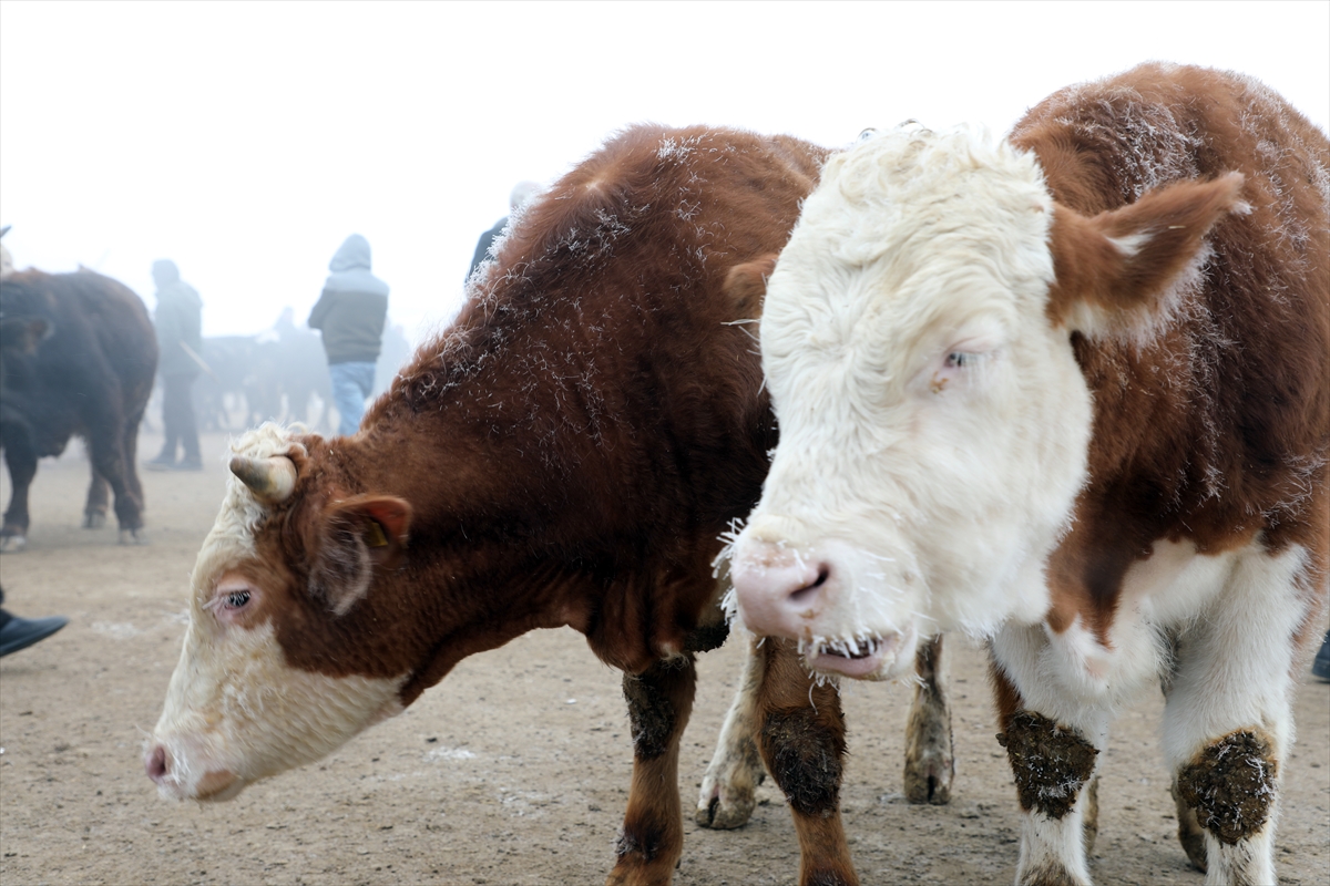 Besiciler ve alıcılar arasında sıkı pazarlıkların yaşandığı borsada, dondurucu soğuklar nedeniyle hayvanların yüz bölgesi kırağı tutuyor.