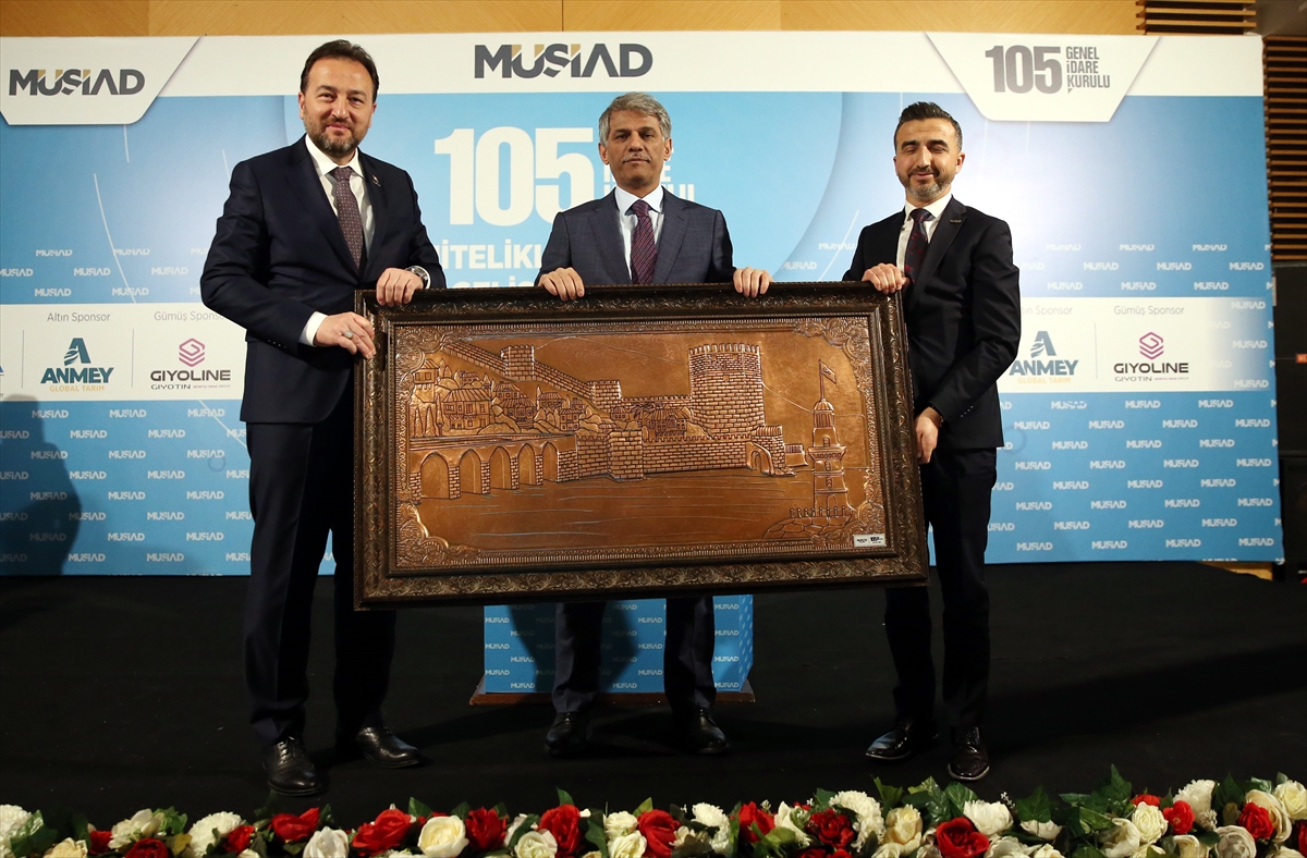 Konuşmasının ardından Alparslan'a MÜSİAD Genel Başkanı Mahmut Asmalı ve MÜSİAD Alanya Şube Başkanı Mustafa Durusoy tarafından 'Kızılkule ve Tersane' motifli bakır tablo hediye edildi.