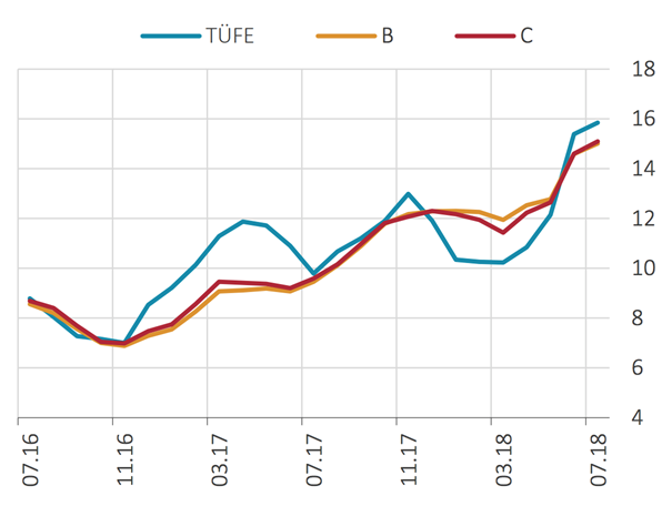 ÖKTG-B ve ÖKTG-C göstergelerinin yıllık değişim oranları yüzde 15,01 ve 15,10 olarak gerçekleşti. Söz konusu dönemde temel mal ve hizmet grubunun katkısının çekirdek enflasyon göstergelerine yansımaya devam ettiği gözlemleniyor.